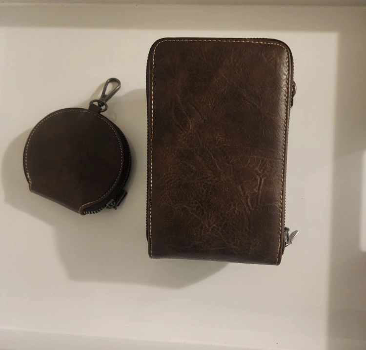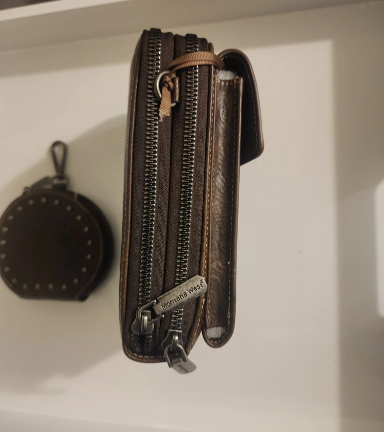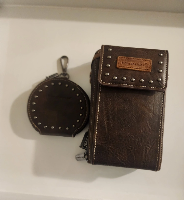 Selling a Montana West wallet and coin purse set. Both are a dark brown colour and feature studded accents. The wallet has multiple zippers and compartments. Comes from a smoke-free home