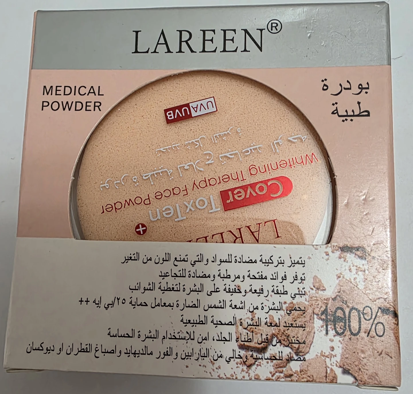 This LAREEN medical powder provides whitening and moisturizing benefits while being anti-wrinkle. It creates a light layer to cover imperfections and protects from sun damage with SPF 25. It's formulated to be safe for sensitive skin, free from parabens and formaldehyde.