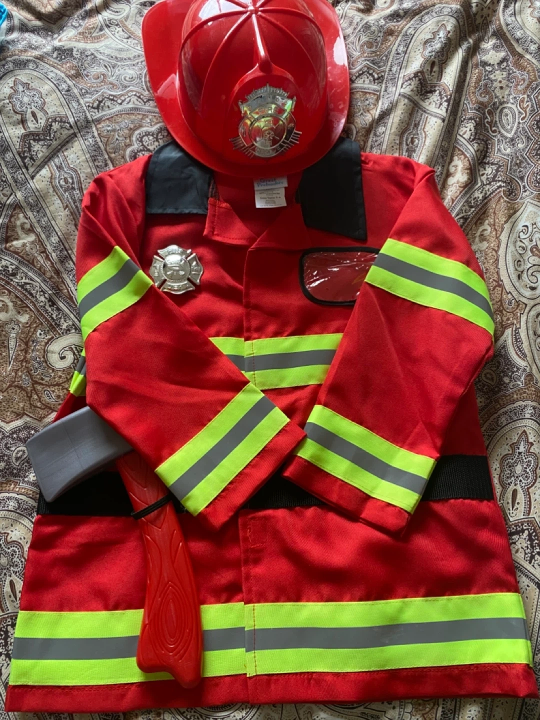This firefighter costume set includes a red jacket with reflective stripes and a matching hat. It also comes with a toy axe accessory. It's great for playtime adventures!