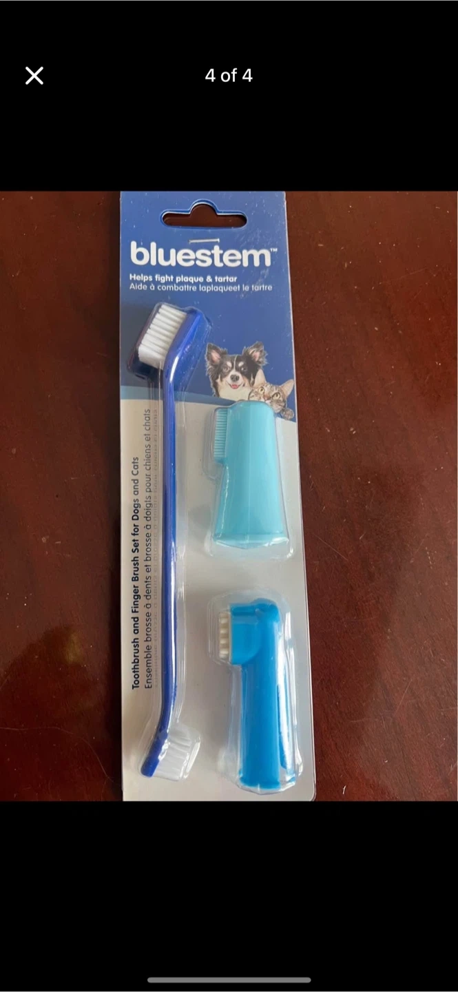 I'm selling a Bluestem toothbrush and finger brush set for dogs and cats. It helps fight plaque and tartar. Great for keeping your pet's teeth clean and healthy!