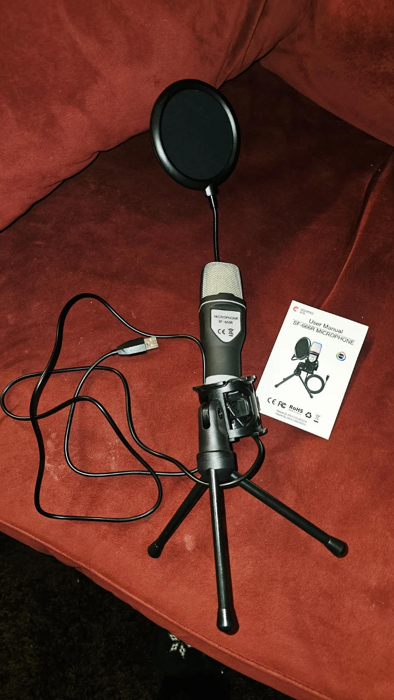 This is a Vovmai SF-666R USB microphone with a tripod stand and pop filter. It's ideal for podcasting or voiceovers. The package includes the microphone, stand, and pop filter. Also information booklet