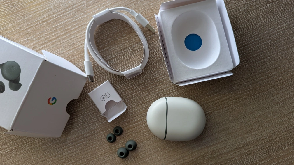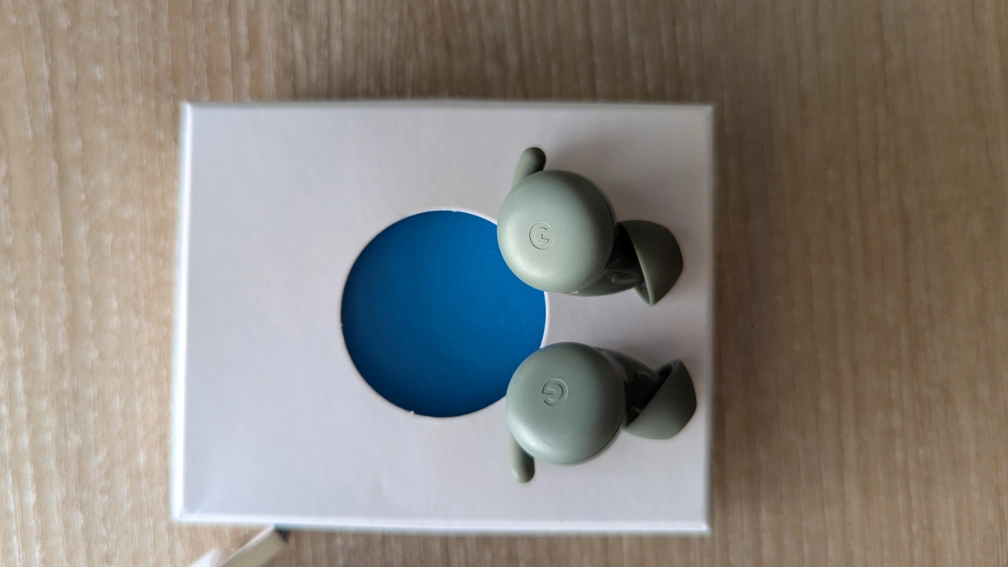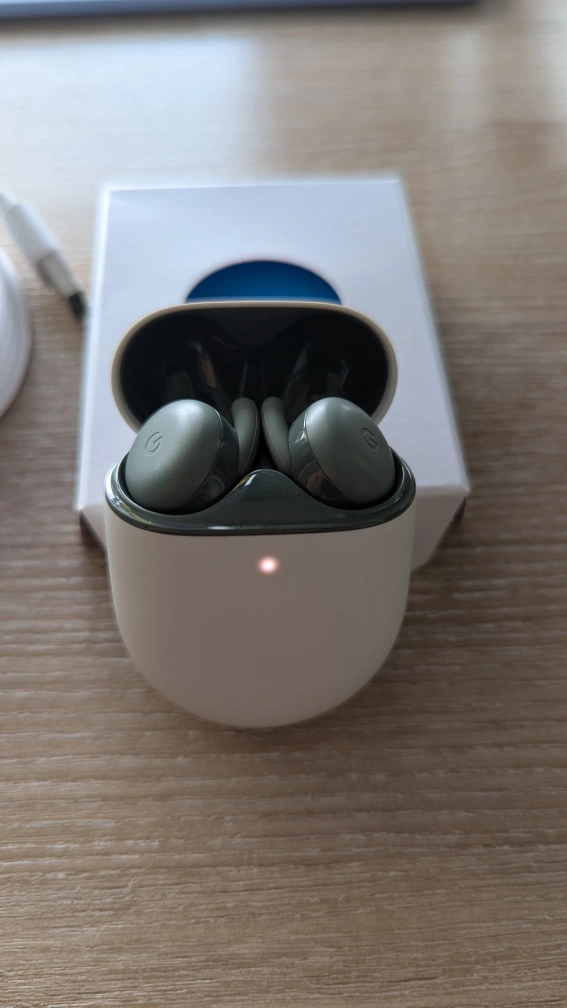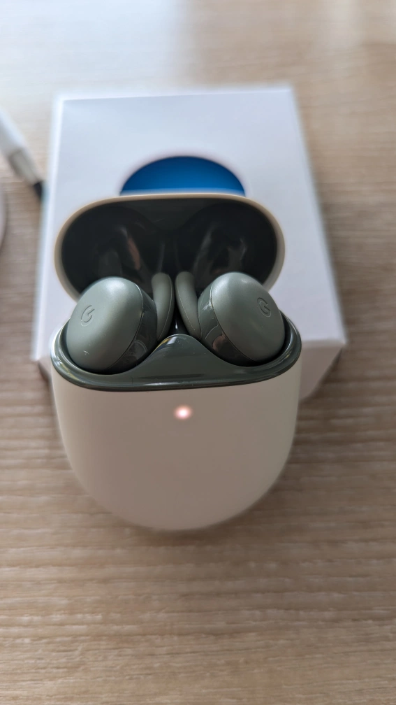 Selling a pair of Google Pixel Buds A-Series in Olive Green. They come with the original box and all included components like the charger and extra ear tips. These earbuds are lightweight and portable. No issues, perfectly good condition.
