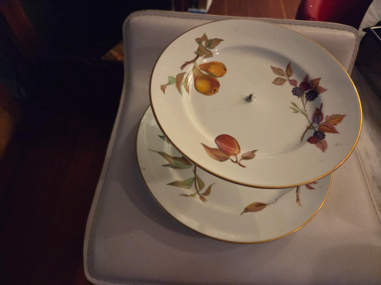 A two-tiered dessert stand with a white ceramic base decorated with painted pears, plums, and blackberries. It features a gold rim on each plate. This stand is perfect for serving pastries, fruits, or appetizers at gatherings.