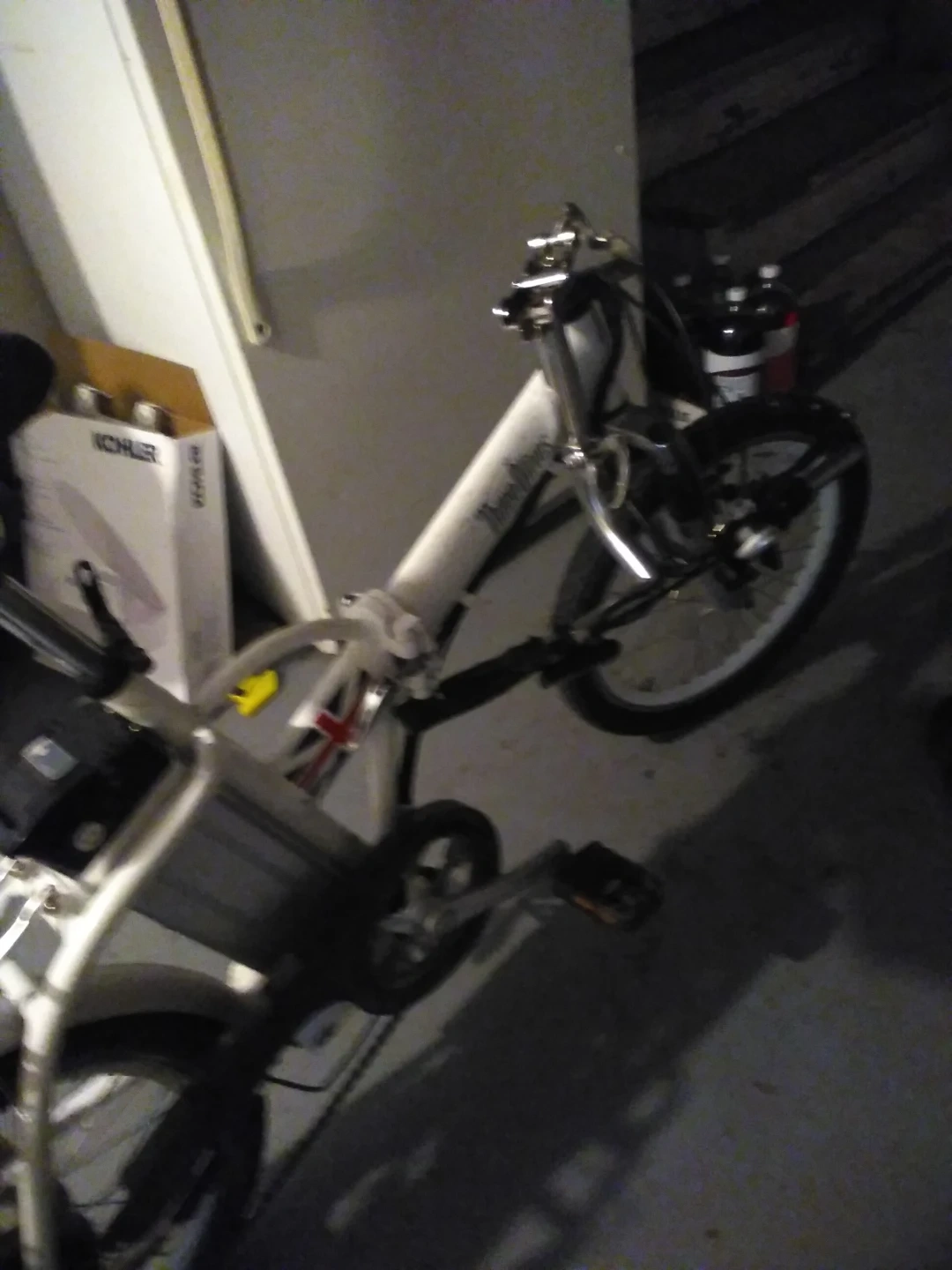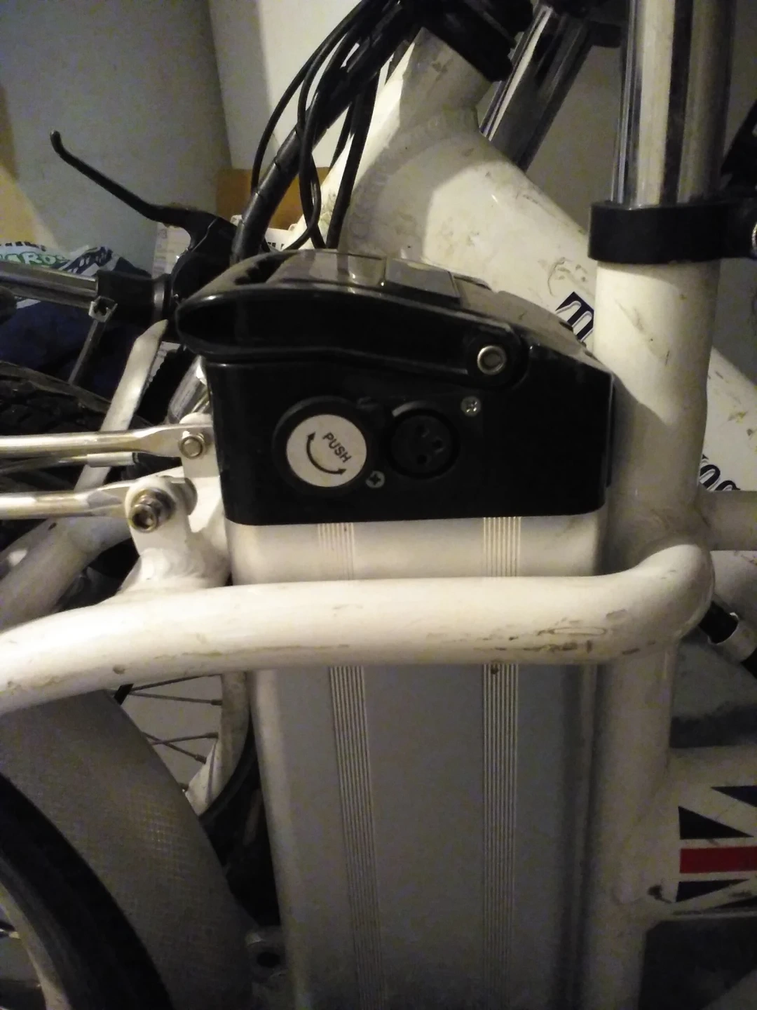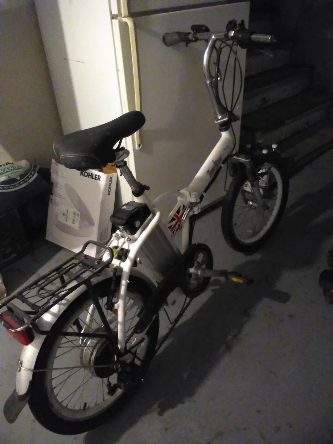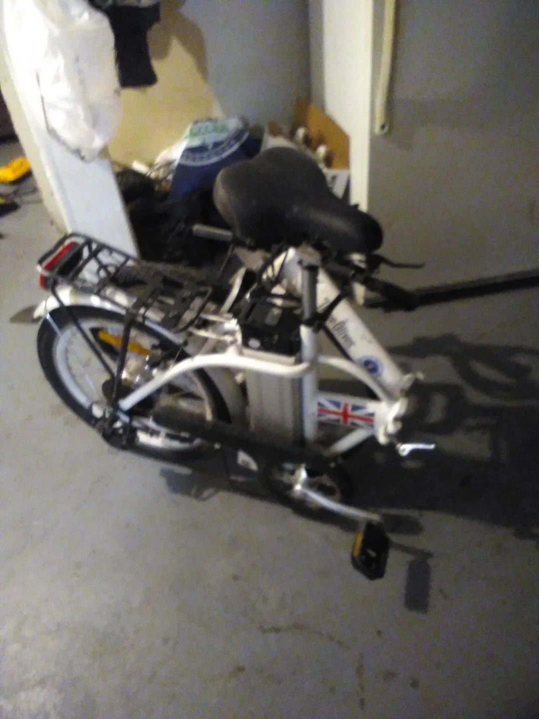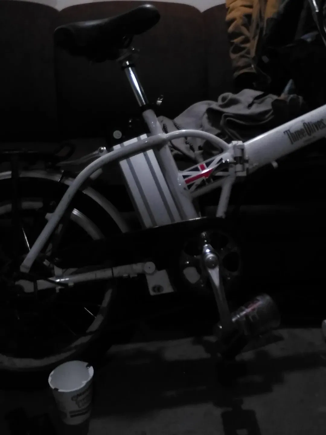 This is a white Three Olives folding electric bike. It has a Union Jack decal on the frame. The bike is equipped with a battery for electric assistance.