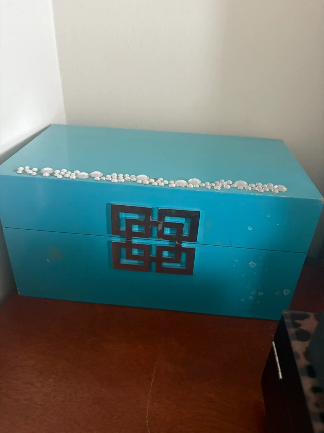 Pretty turquoise decorative box with a geometric latch. It's adorned with small pearl-like beads across the top. This box is great for storing small treasures or keepsakes!