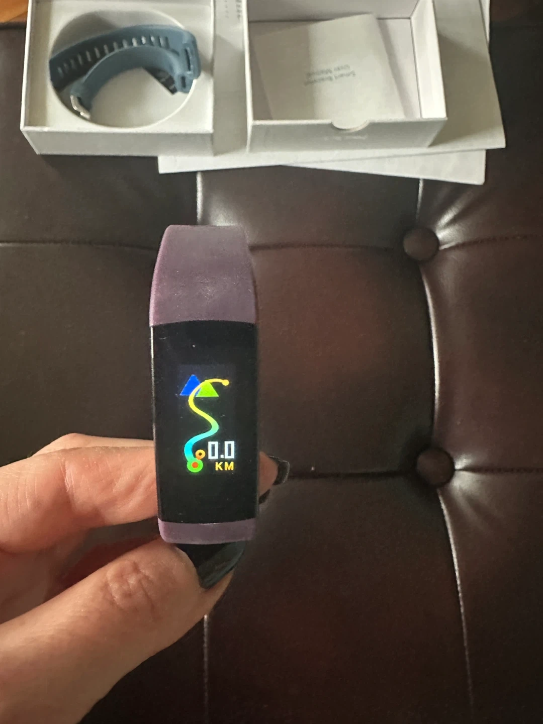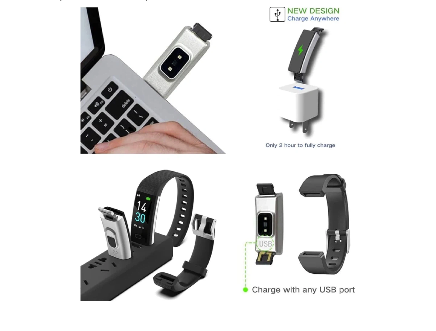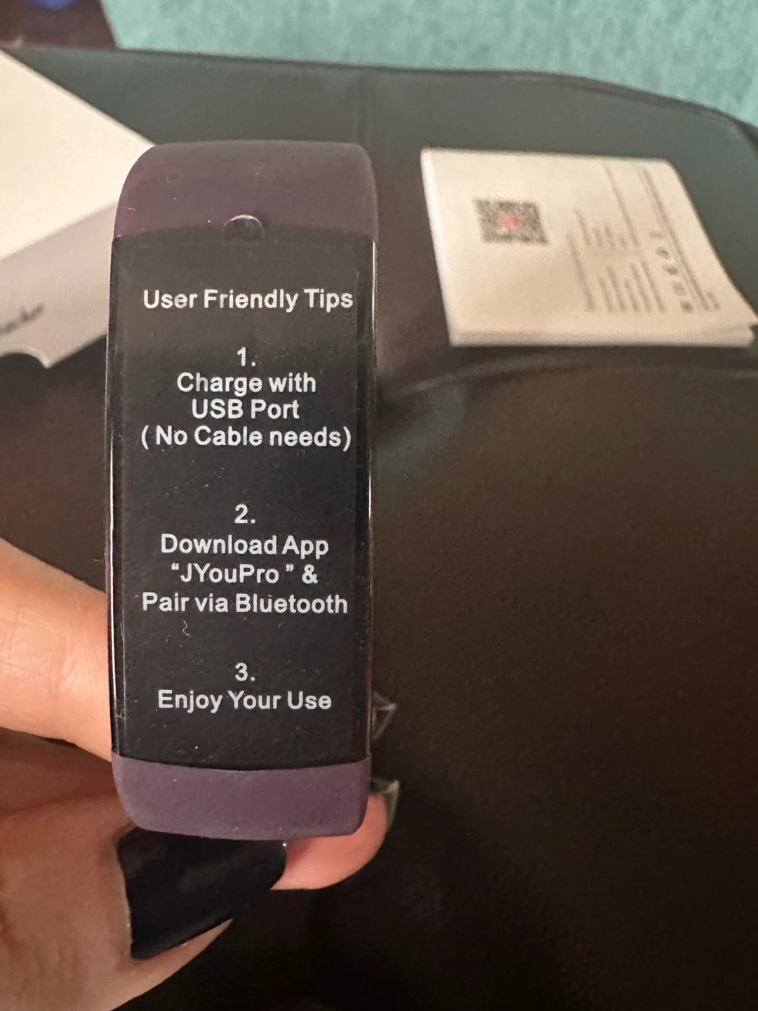 This is a smart bracelet fitness tracker in purple. It charges directly via USB port, no cable needed. Supports Bluetooth pairing with the 'JYouPro' app for use.