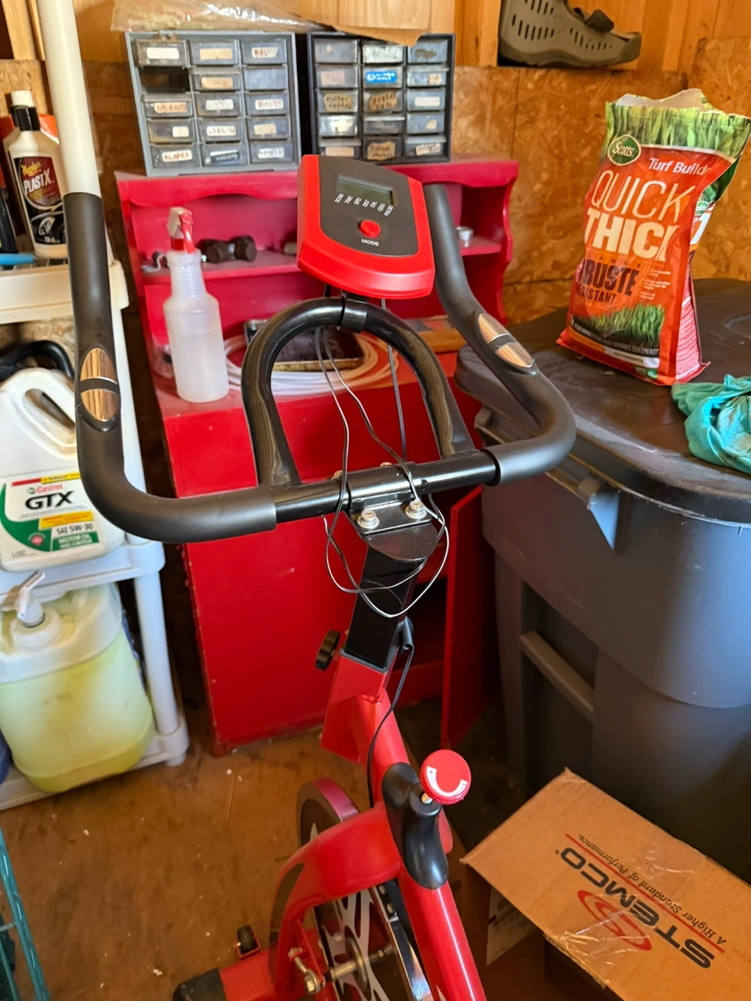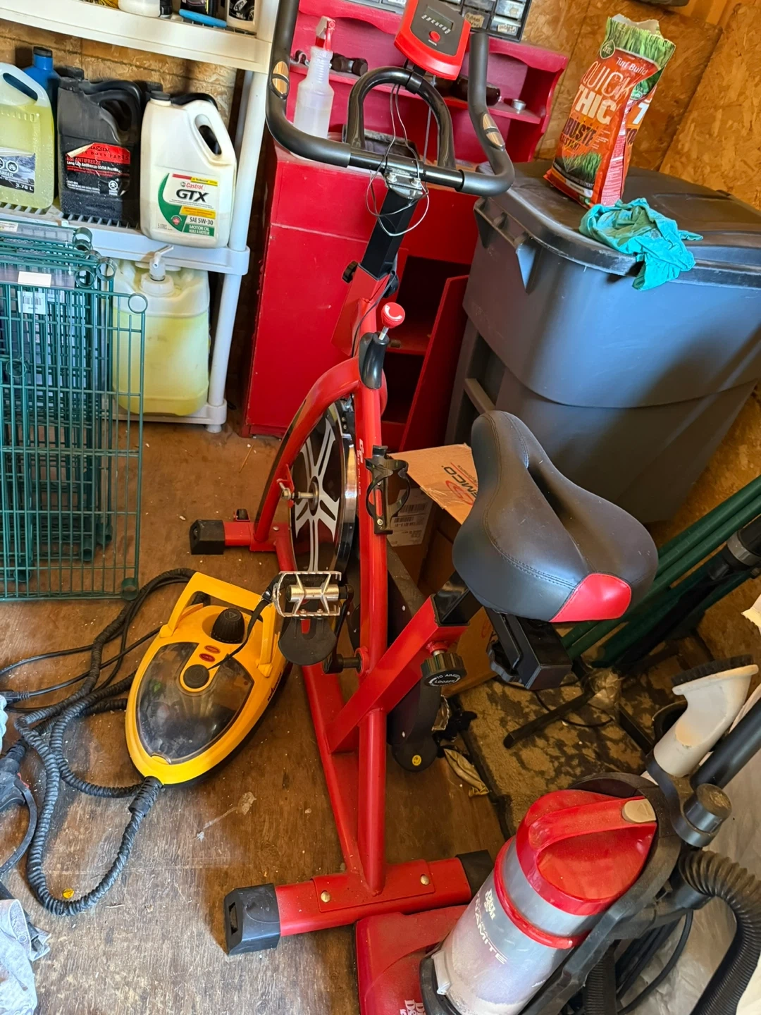 This red spin bike is perfect for your home gym. It features an adjustable seat and handlebars for a comfortable workout. Resistance knob included for customizable intensity. A water bottle holder is attached.