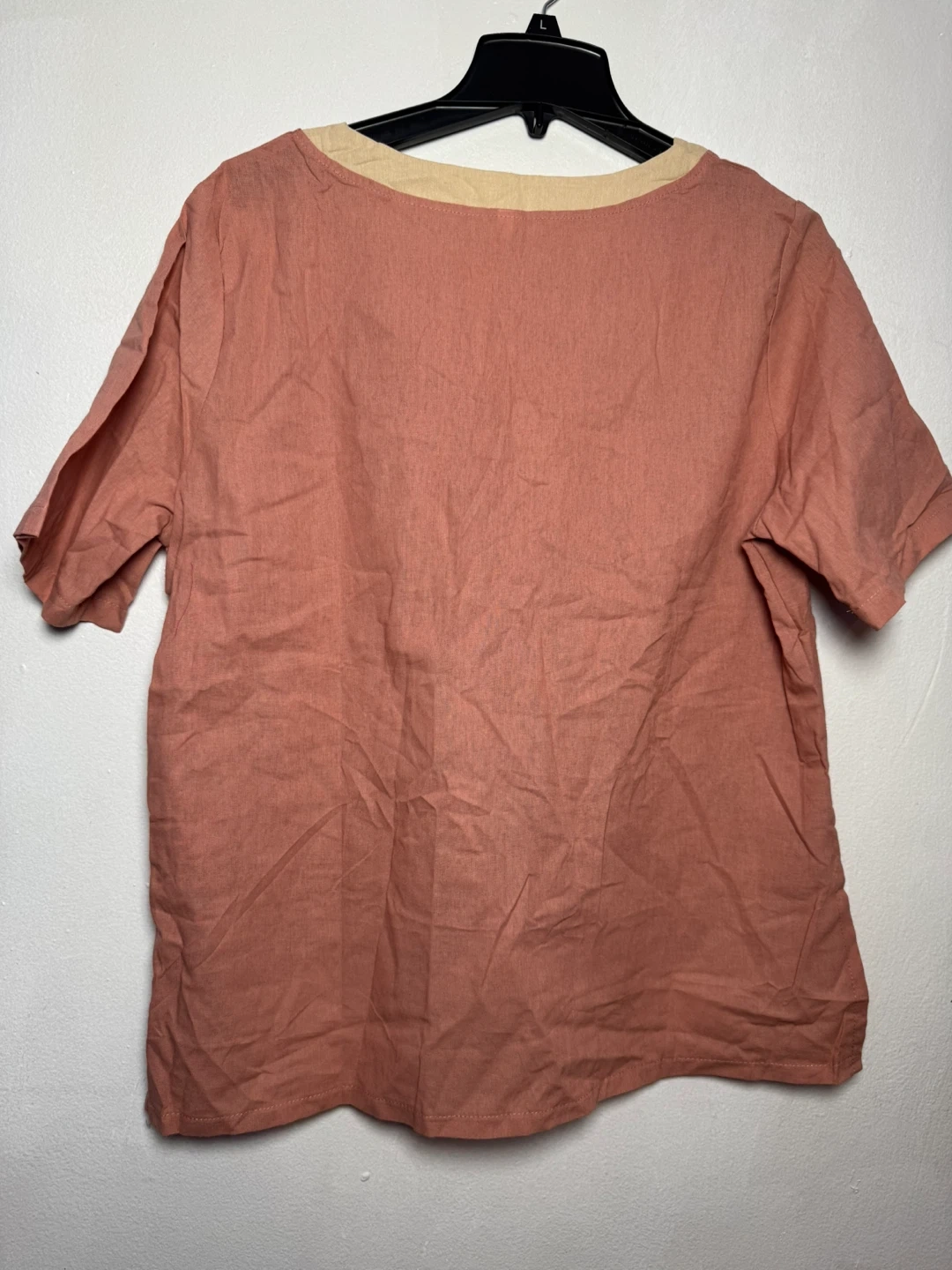 This is a women's short-sleeve top in a coral pink color. It features delicate floral and bird embroidery along the hemline. The neckline has a contrasting light beige trim. The material appears to be a linen blend.