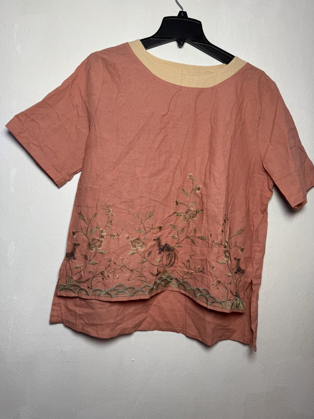 This is a women's short-sleeve top in a coral pink color. It features delicate floral and bird embroidery along the hemline. The neckline has a contrasting light beige trim. The material appears to be a linen blend.