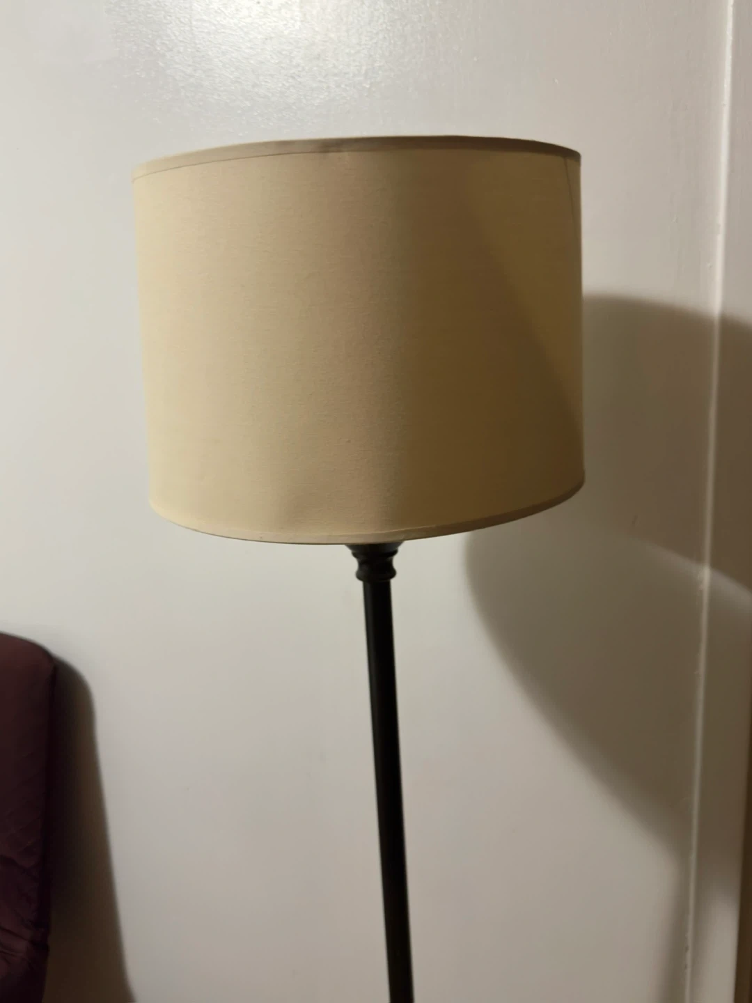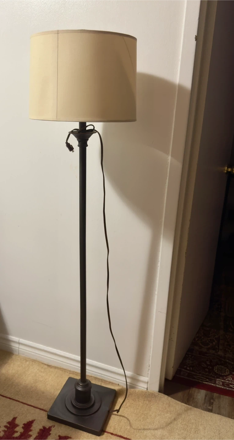 This is a floor lamp with a dark metal stand and a beige fabric shade. It's a classic design that provides ambient lighting. The base is square and weighted for stability. It's suitable for adding light to a living room or bedroom.
