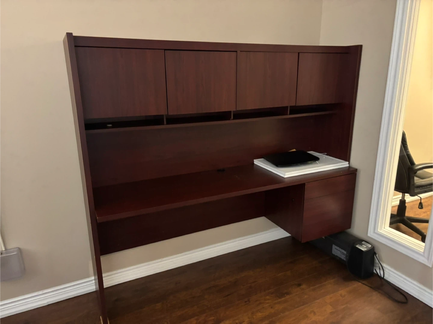 Selling a desk with a hutch in a dark wood finish. It's in good condition and ready for a new home! Perfect for a home office or study space. It features a spacious work surface and plenty of storage with the hutch and drawers