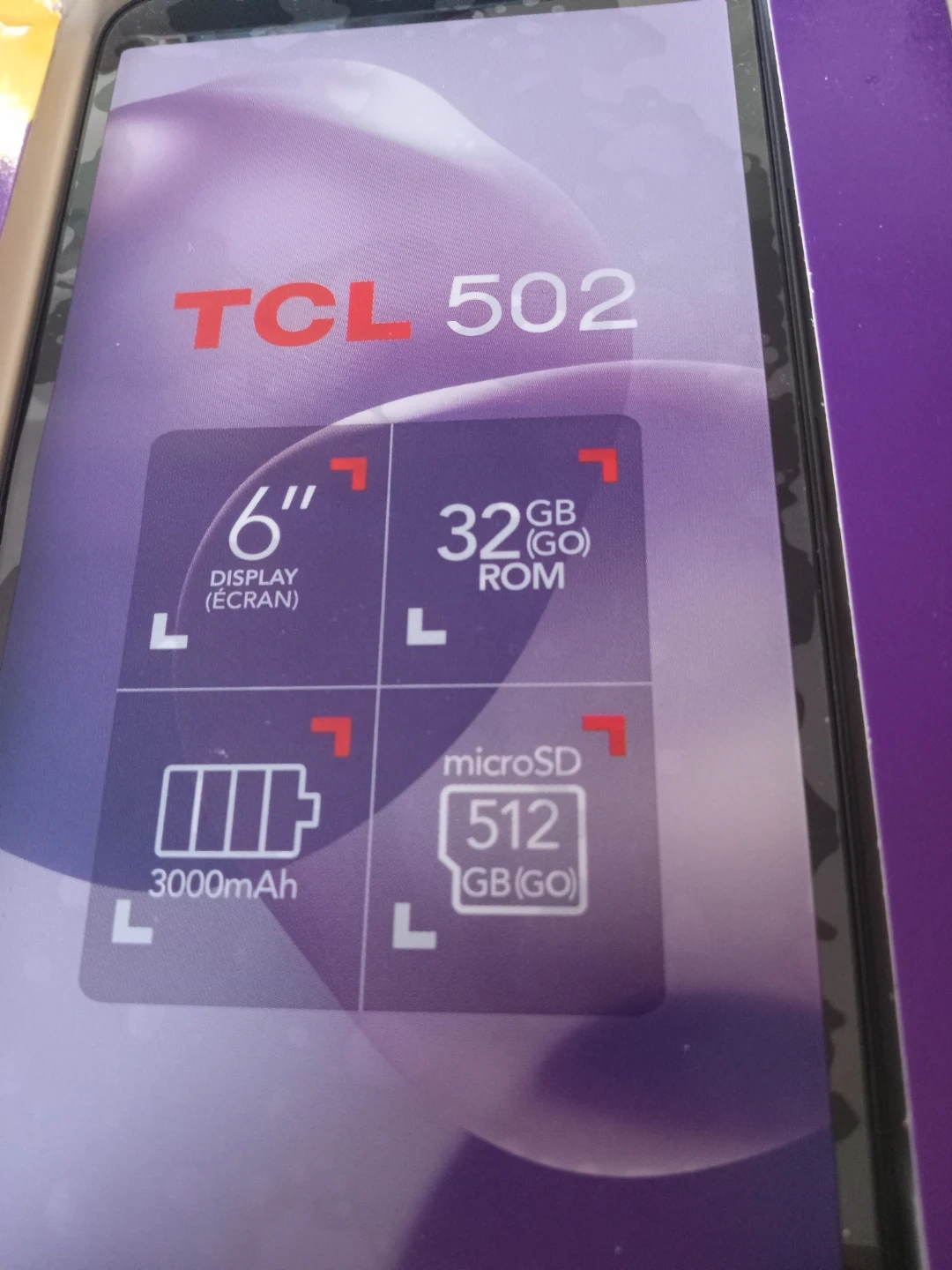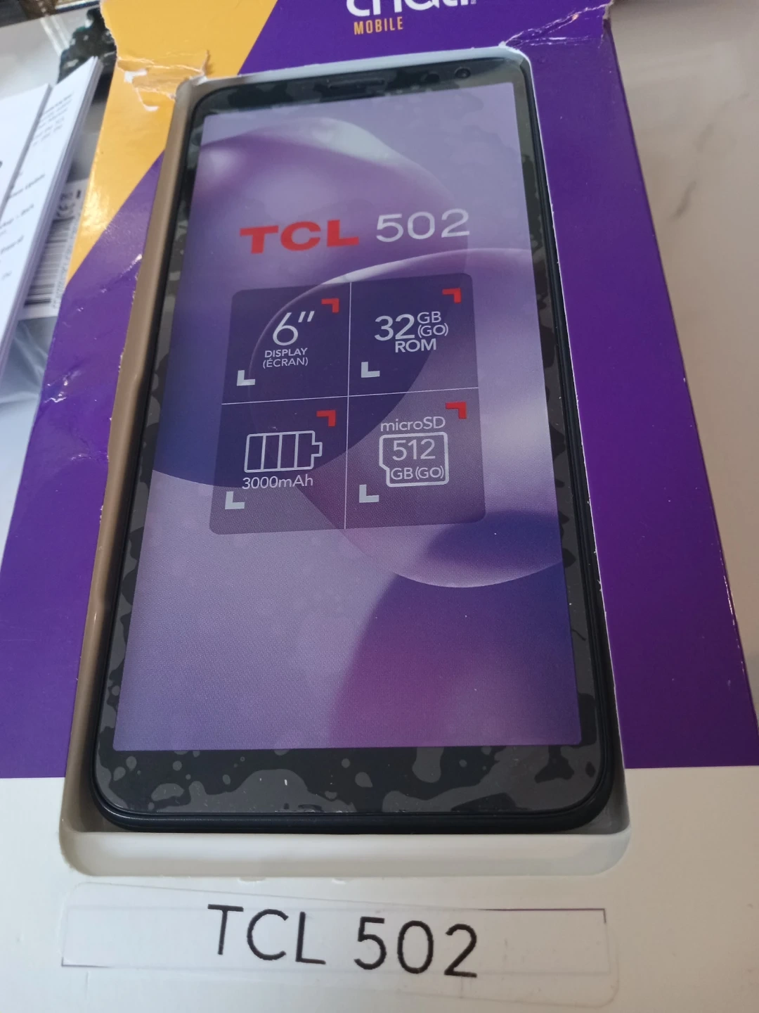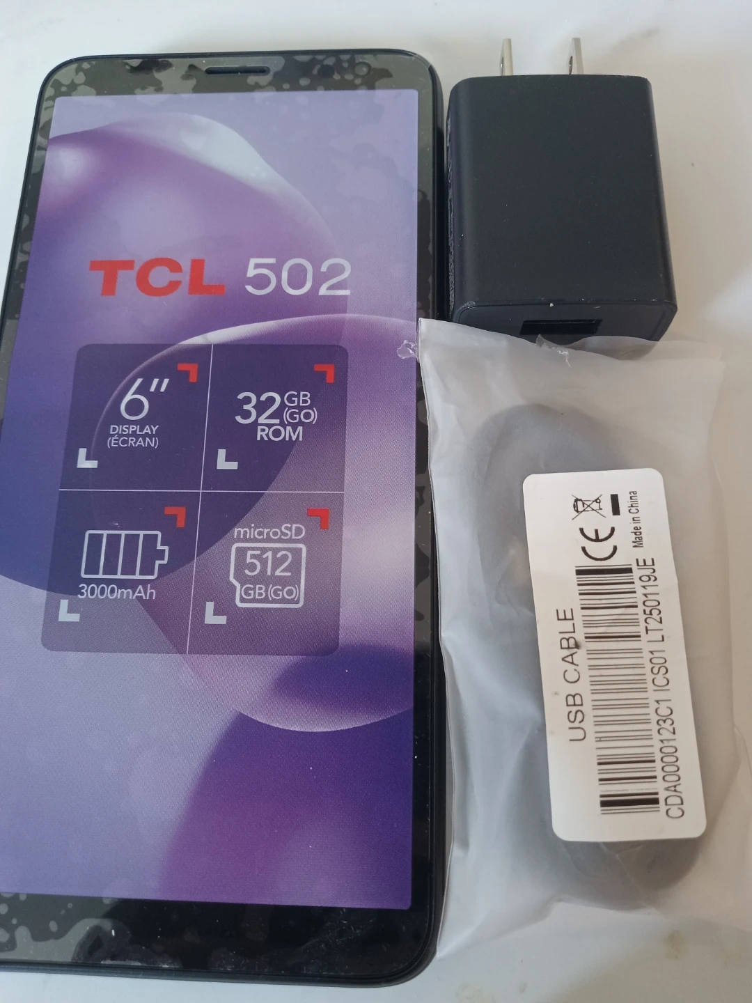 Selling a brand new TCL 502! It has a 6" display and 32GB ROM. Also features a 3000mAh battery and supports up to 512GB. Comes with the box, charger, and USB cable,