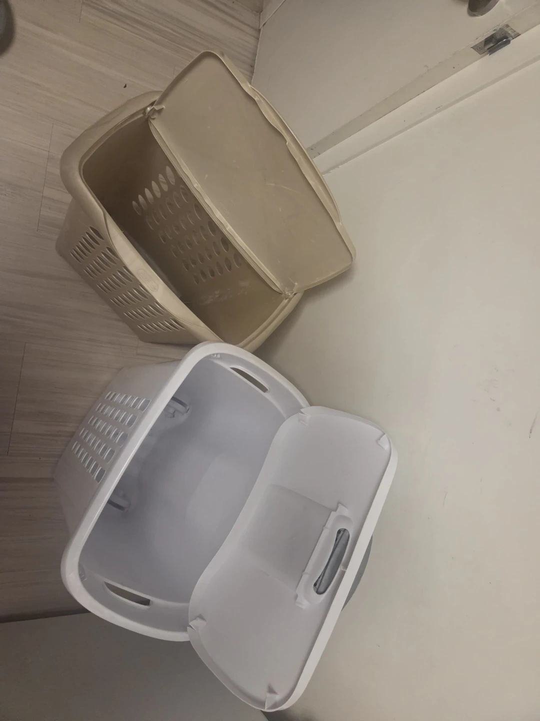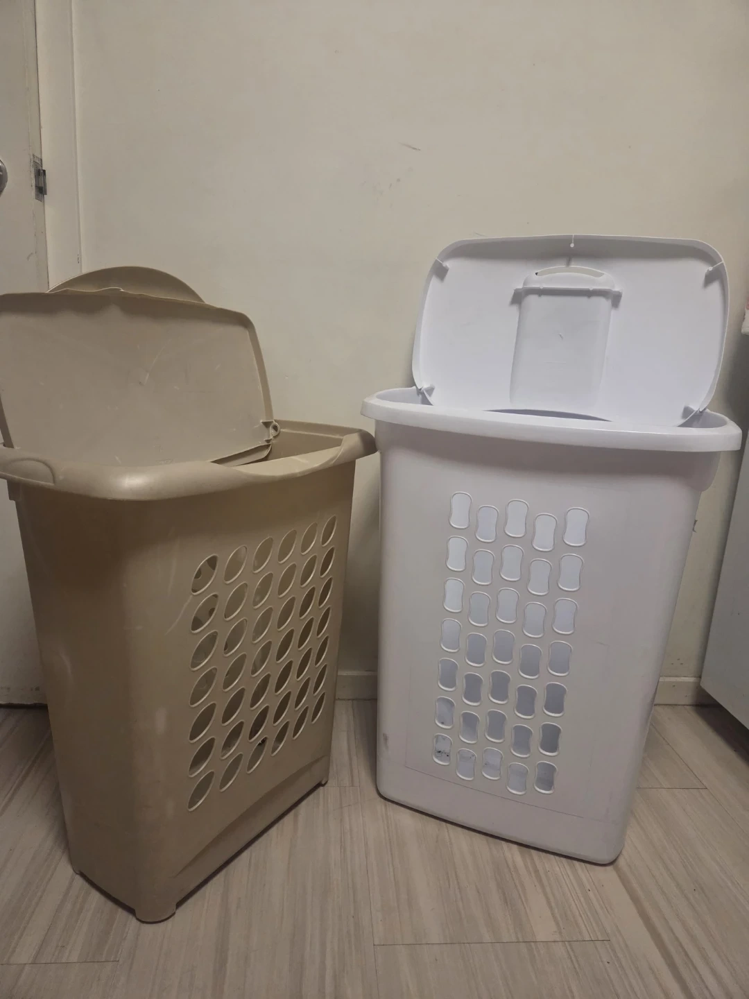 Two laundry baskets, one tan and one white. Both have lids and are made of plastic. They're great for storing and transporting laundry. They're a practical addition to any home!