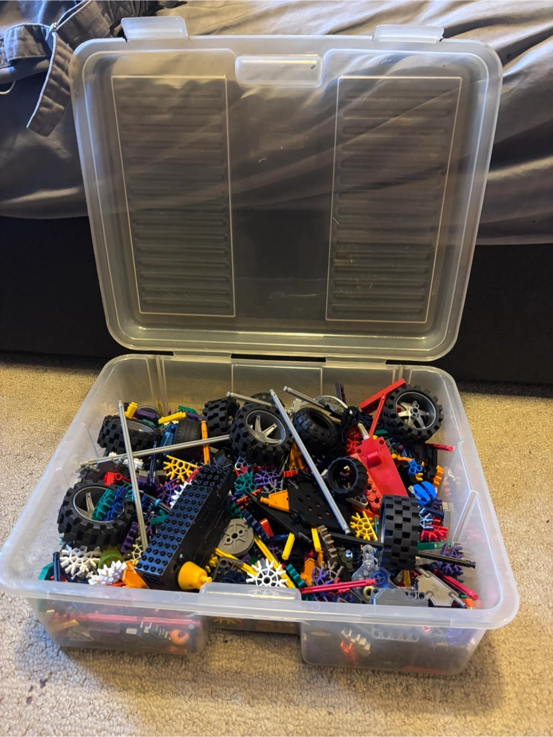 A clear storage bin filled with various building toy pieces, including wheels, connectors, and structural elements. Perfect for creative building projects and imaginative play. It's a great way to keep all your toy pieces organized!
