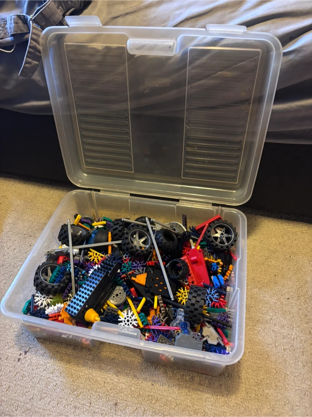 A clear storage bin filled with various building toy pieces, including wheels, connectors, and structural elements. Perfect for creative building projects and imaginative play. It's a great way to keep all your toy pieces organized!