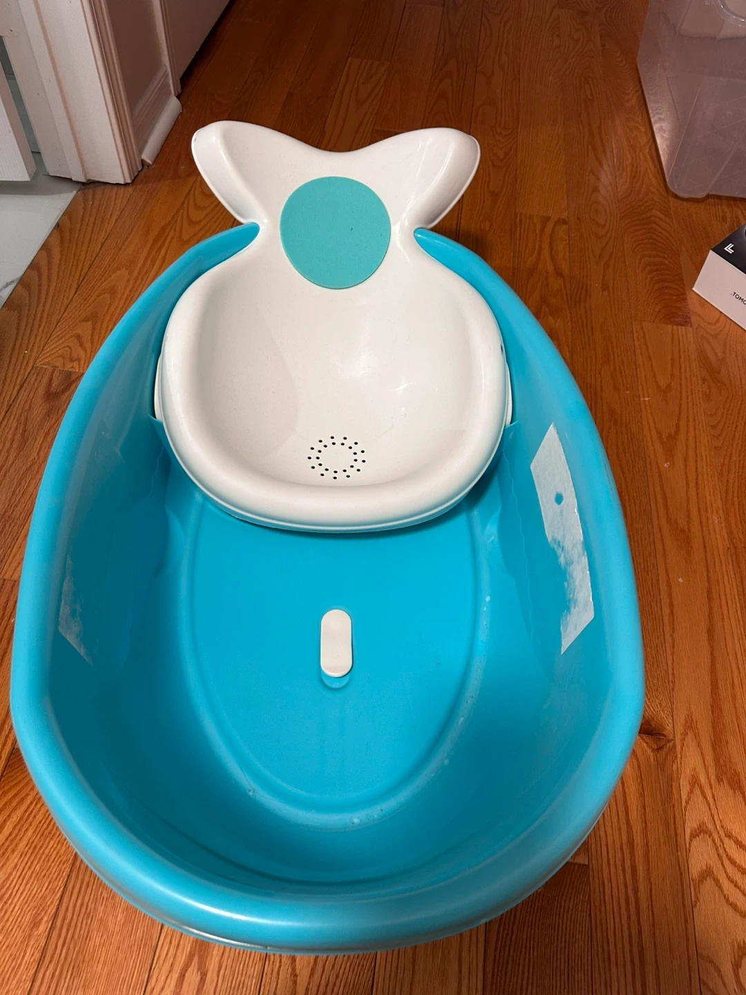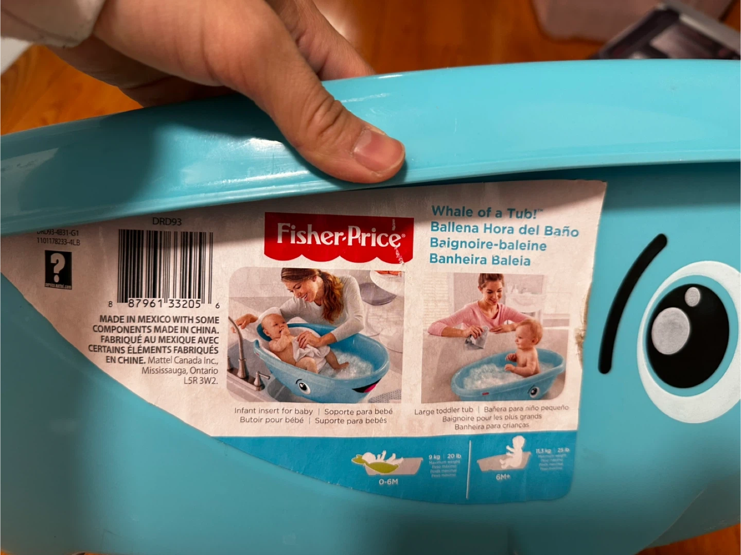 This Fisher-Price Whale of a Tub baby bath seat is designed for infant and toddler use. It includes an infant insert for babies and can be used for larger toddlers. The bath seat is made of plastic and comes in a blue color.
