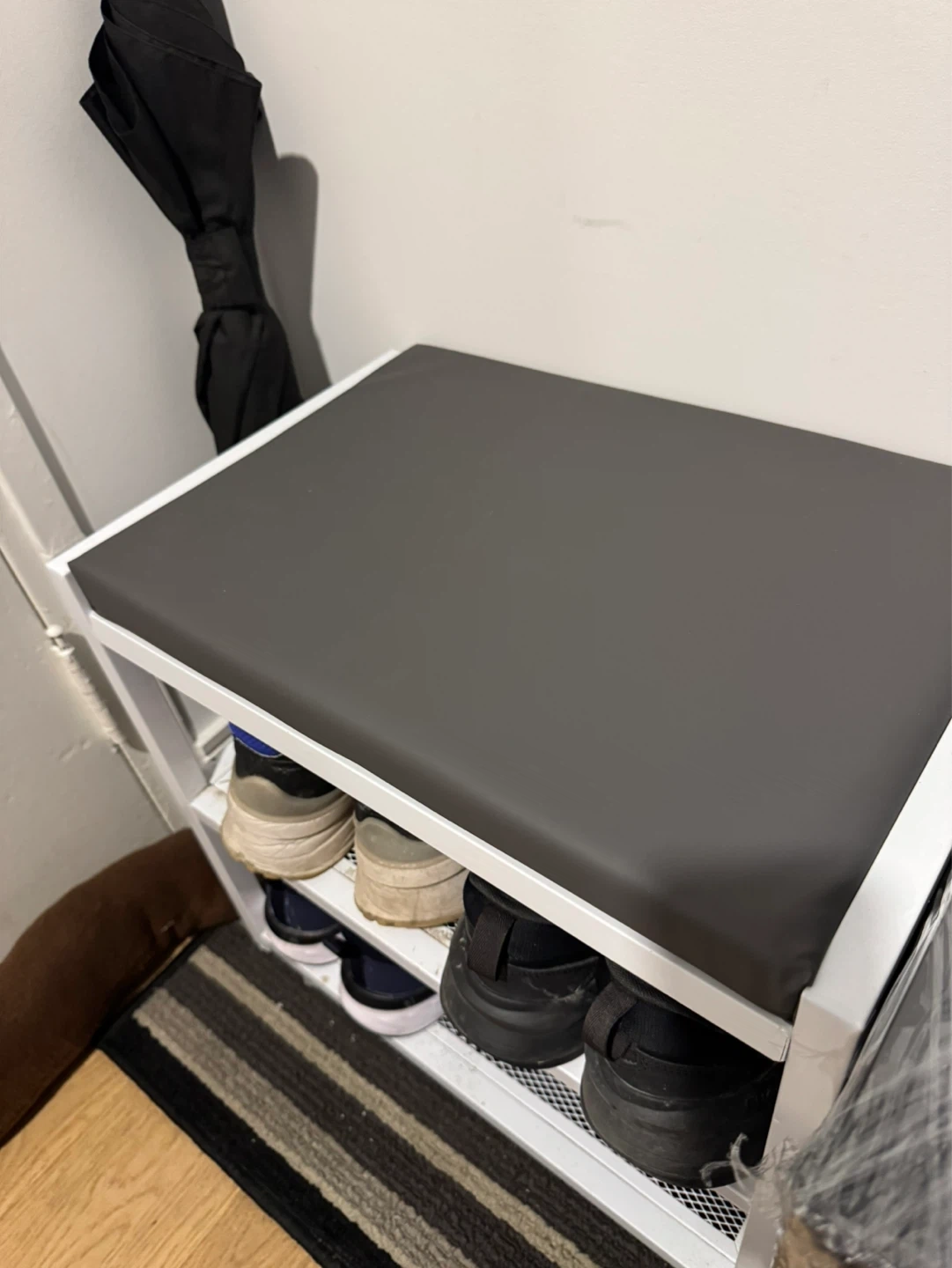 White shoe rack bench with a grey padded top. It's great for organizing footwear and provides a convenient place to sit.