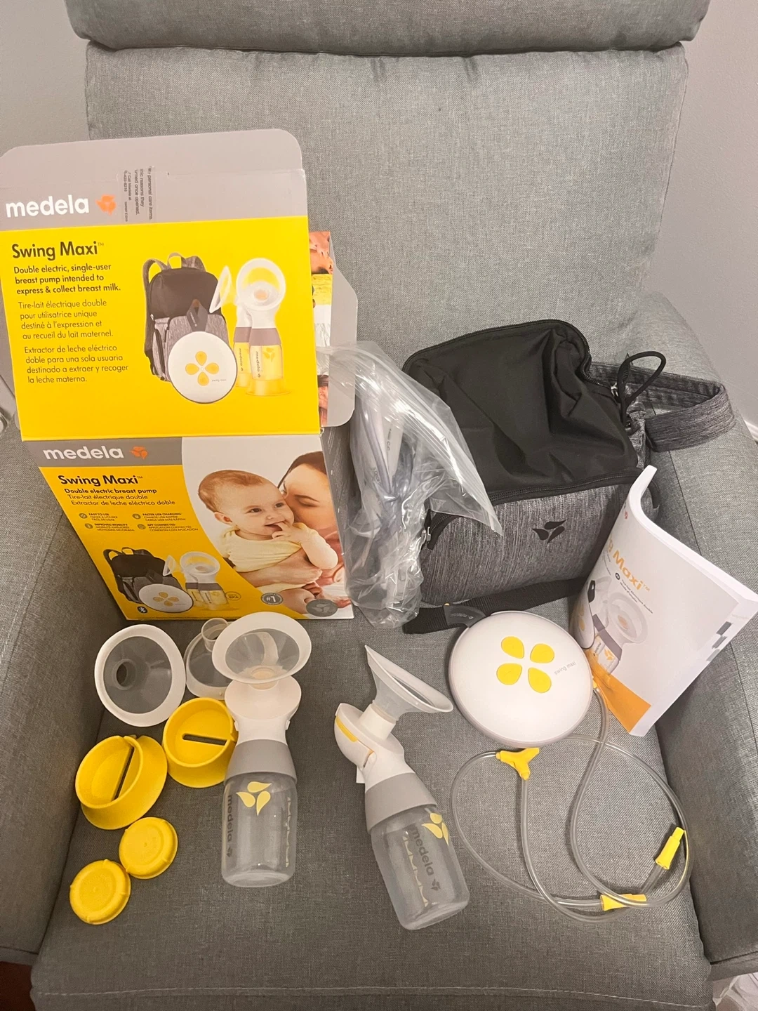 This is a Medela Swing Maxi double electric breast pump. It's designed for ease of use and includes a carry bag. It also features faster USB charging and app connectivity.