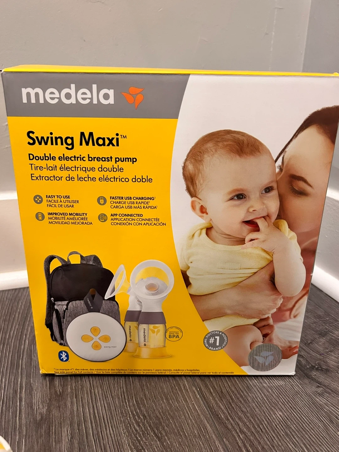 This is a Medela Swing Maxi double electric breast pump. It's designed for ease of use and includes a carry bag. It also features faster USB charging and app connectivity.