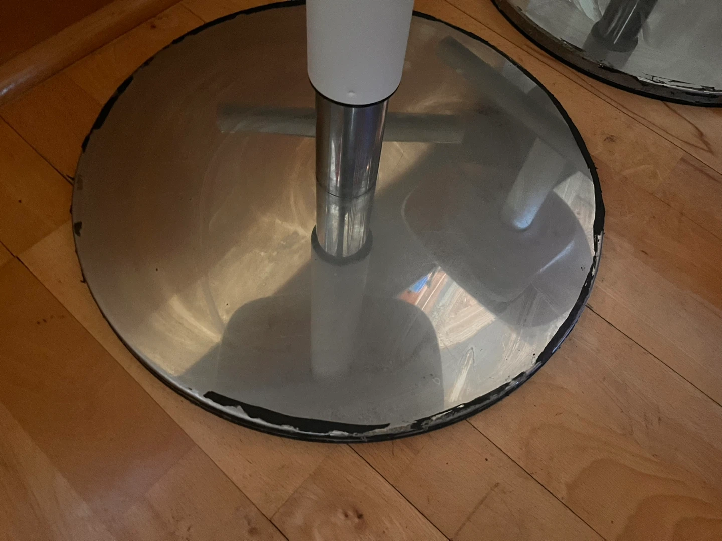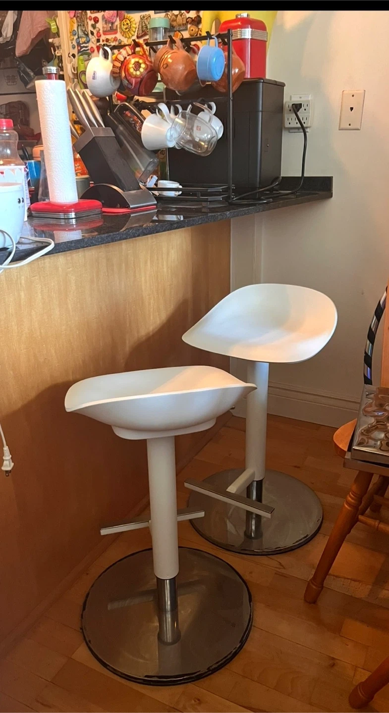 white adjustable bar stool with chrome bases. The seats are white plastic and the bases are polished metal. They're perfect for a kitchen island or home bar.