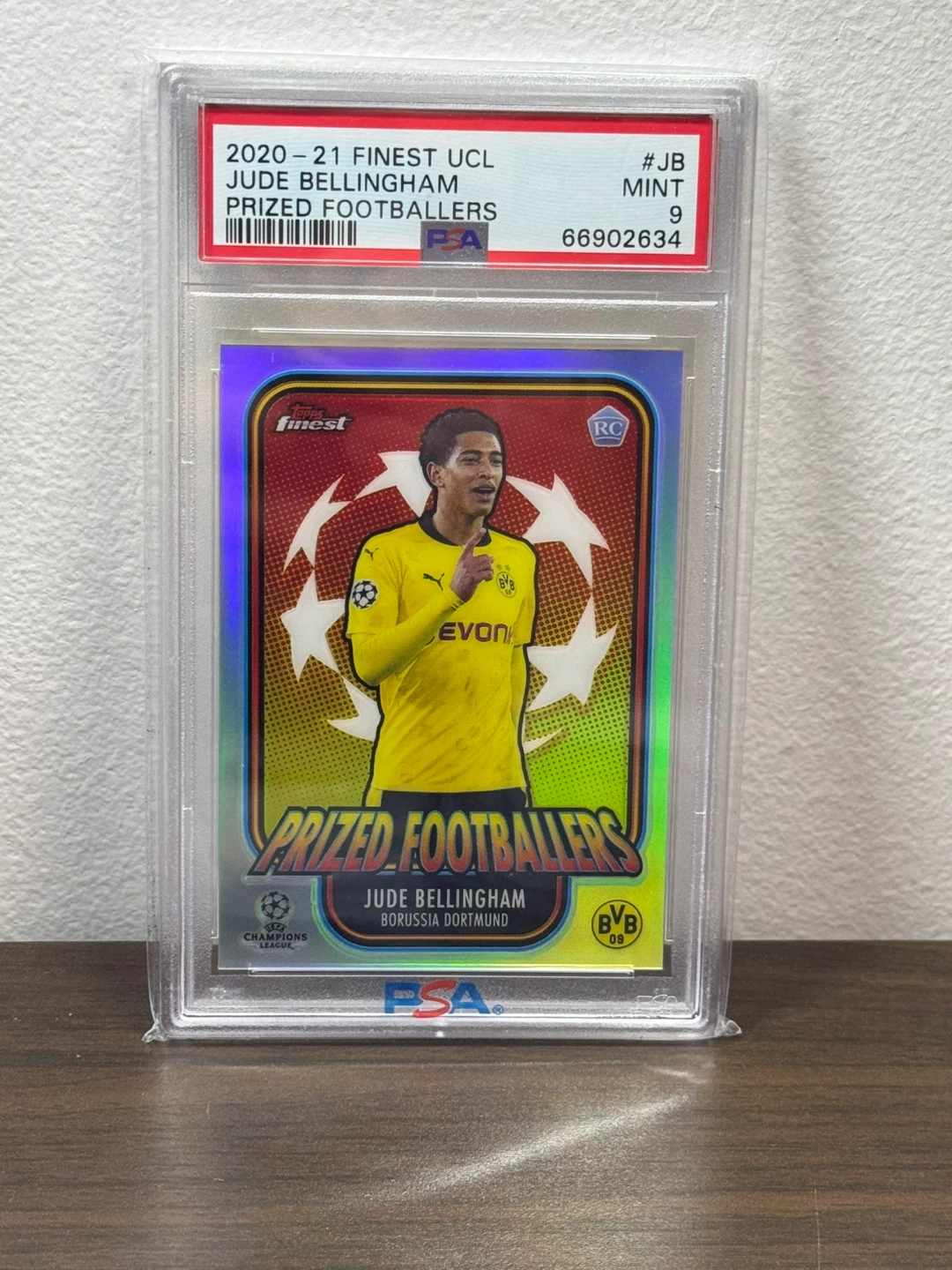 Selling a Jude Bellingham 2020-21 Topps Finest UCL "Prized Footballers" trading card, graded PSA 9. It's in mint condition and ready for a new collection!
