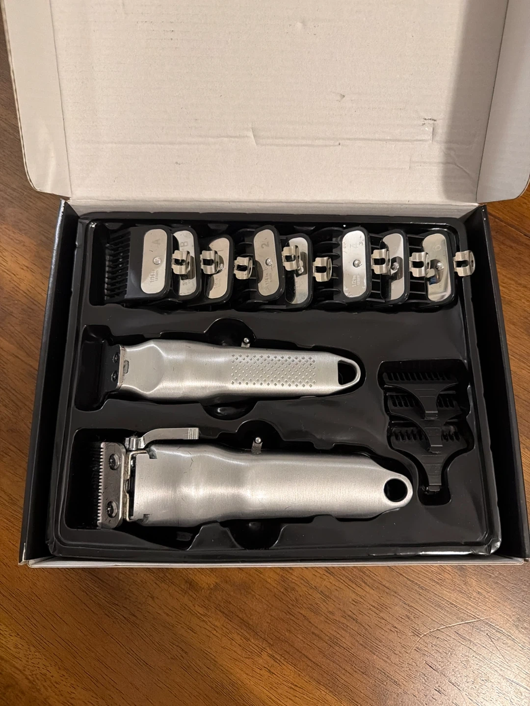 This is a KIKIDO BARBER rechargeable hair clipper and trimmer set. It features an LCD screen and comes with multiple guide combs. Includes the clipper, trimmer, and all accessories shown.