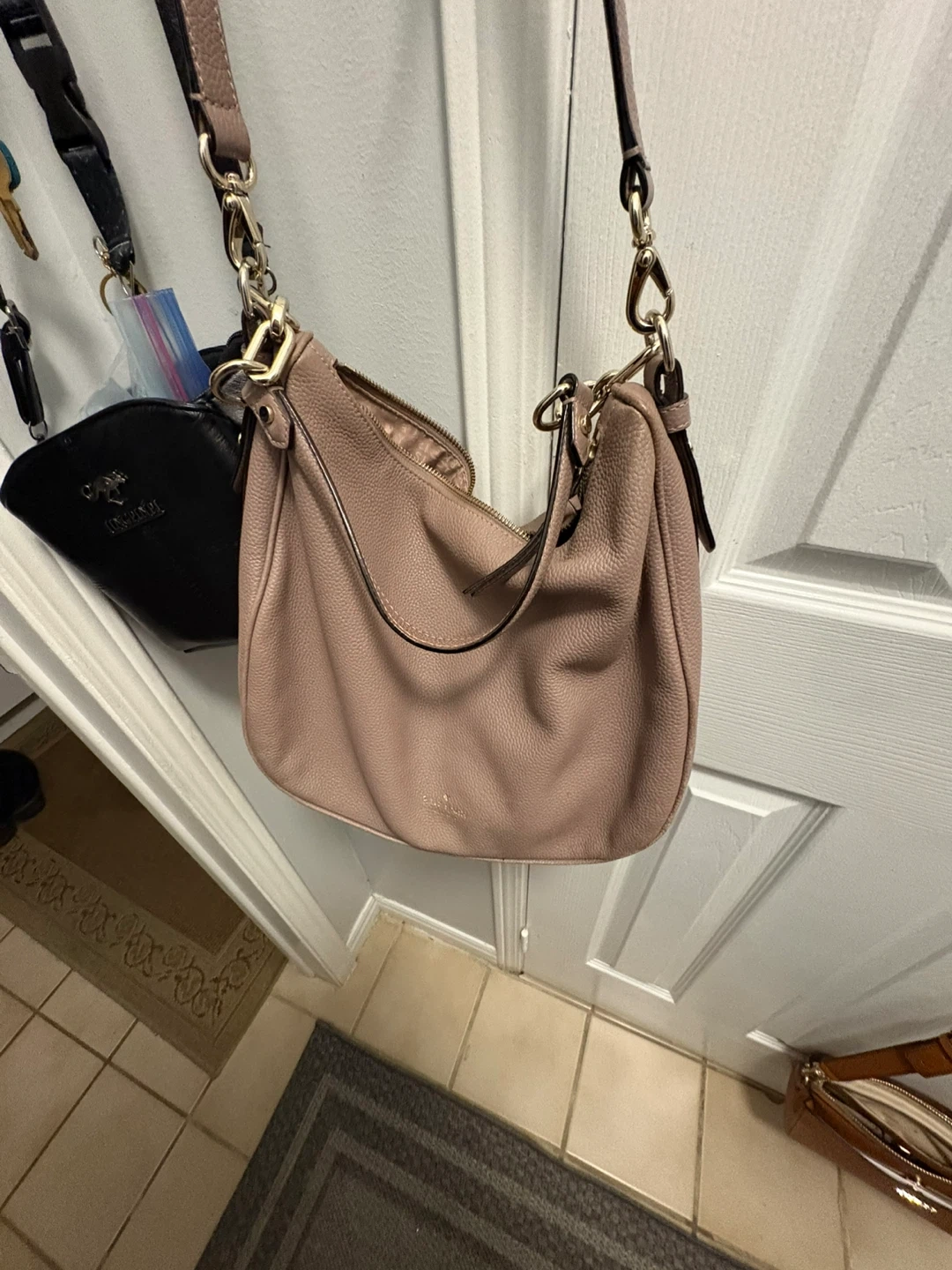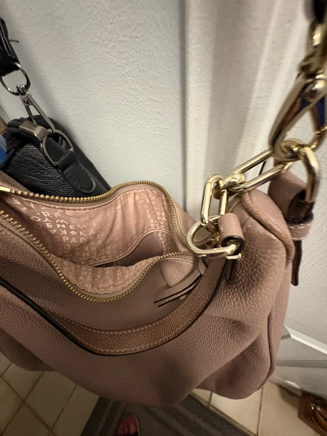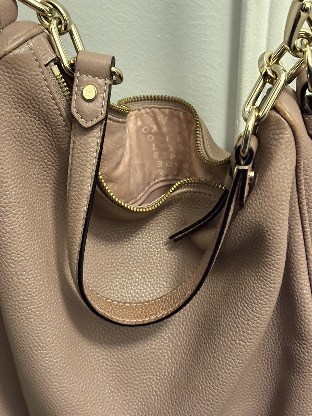Selling a Kate Spade shoulder bag in light pink. It's in good condition and has a gold chain detail!