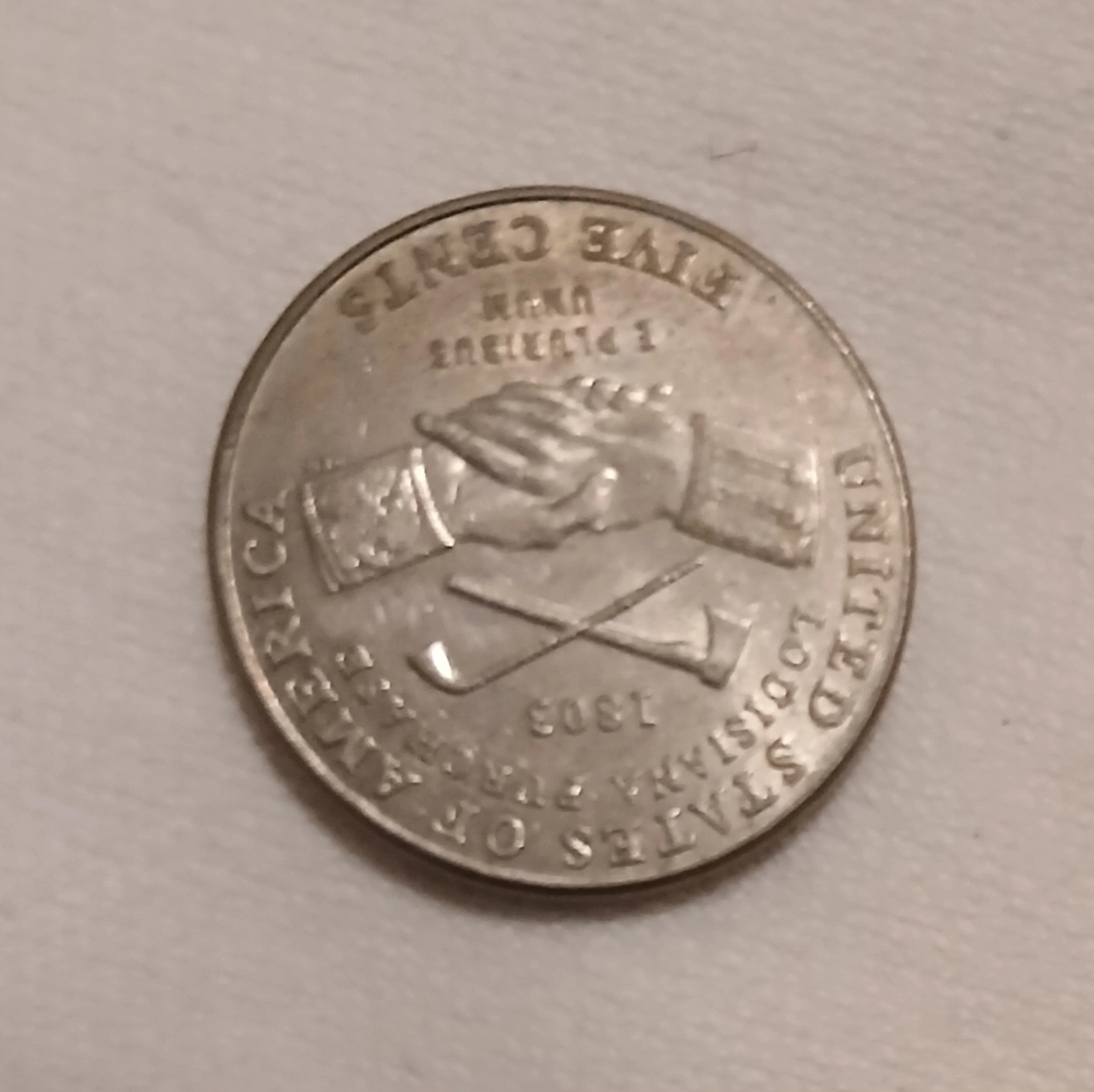 This is a 2004 United States five-cent coin commemorating the Louisiana Purchase. It features Thomas Jefferson on the obverse. The reverse depicts hands clasping over a sextant and a shield.