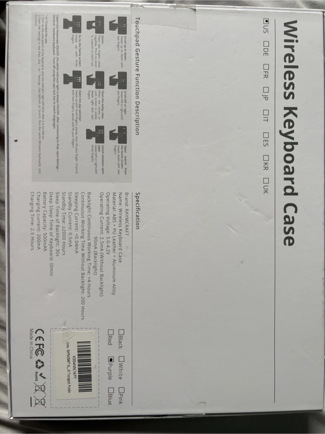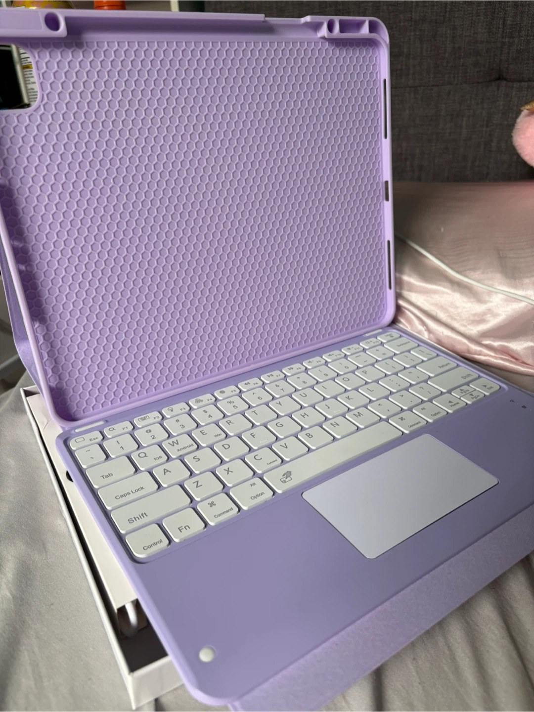 This RaymCraft wireless keyboard case comes in a vibrant purple colour. It's made from ABS, PU Leather, and Aluminium Alloy for durability. The case offers continuous working time without backlight for over 24 hours. This is great for anyone looking to make their tablet