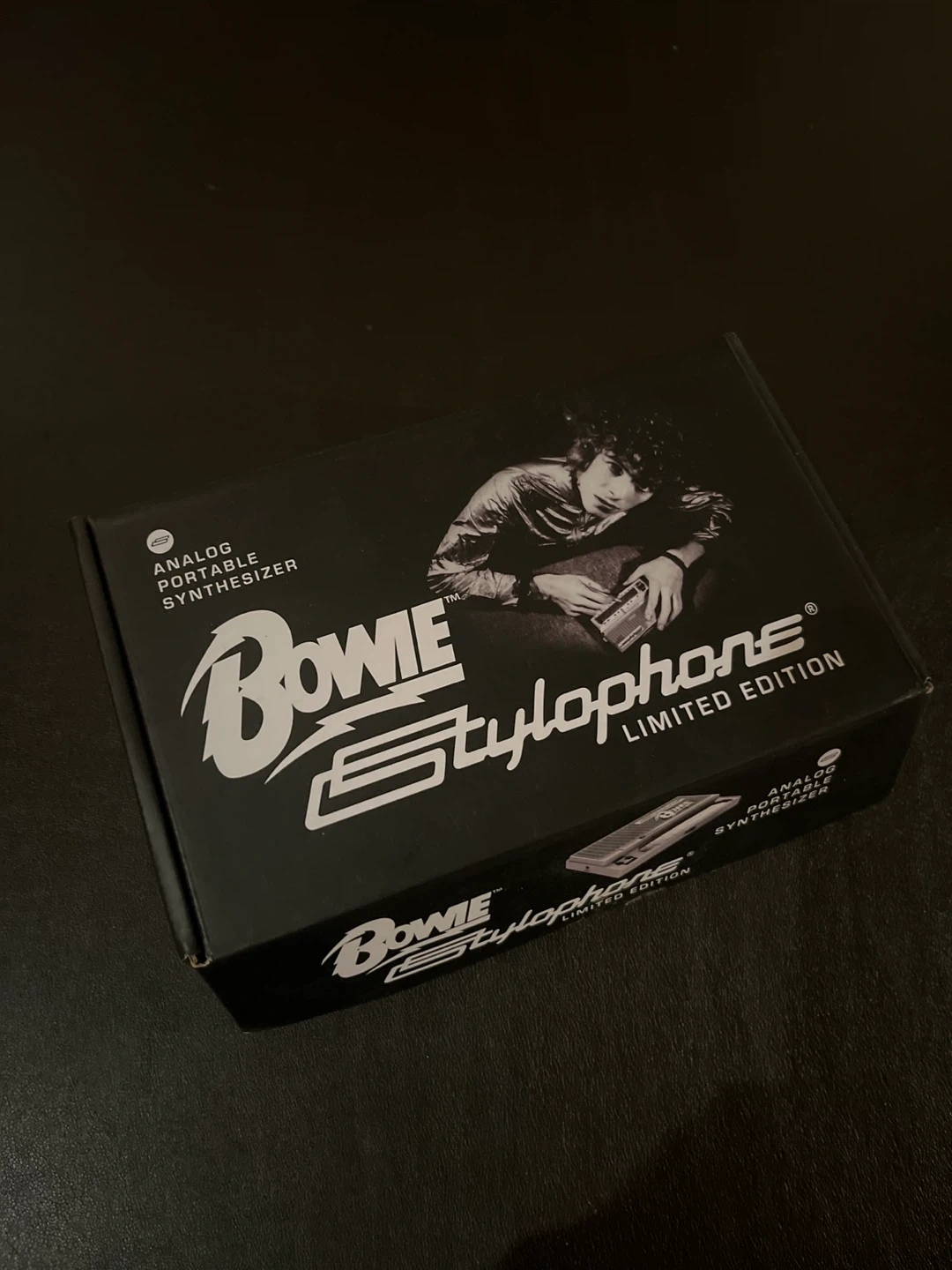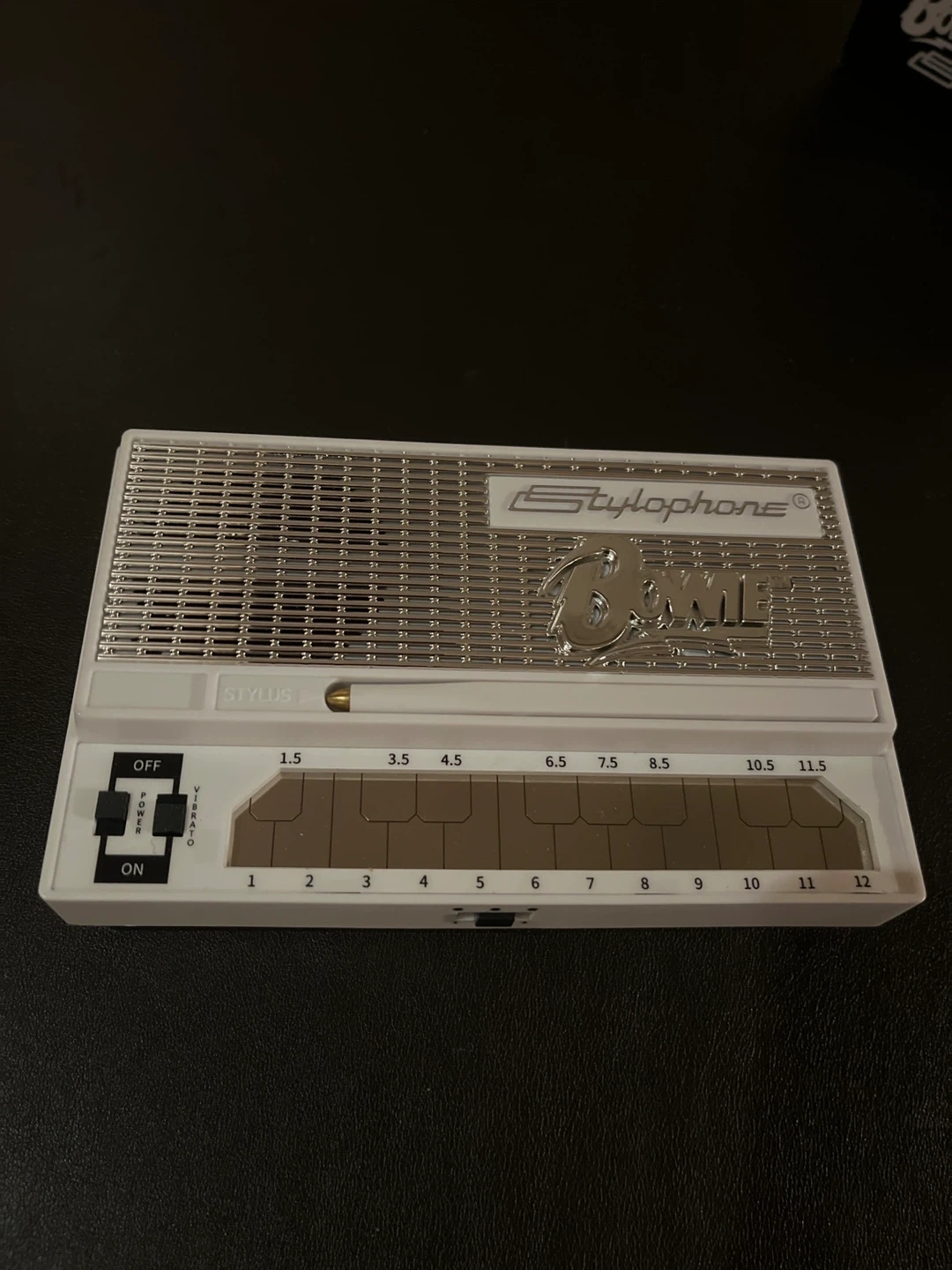 This is a Bowie Limited Edition Stylophone, an analog portable synthesizer. It's white with silver accents and includes the stylus. Comes with original box and paperwork.