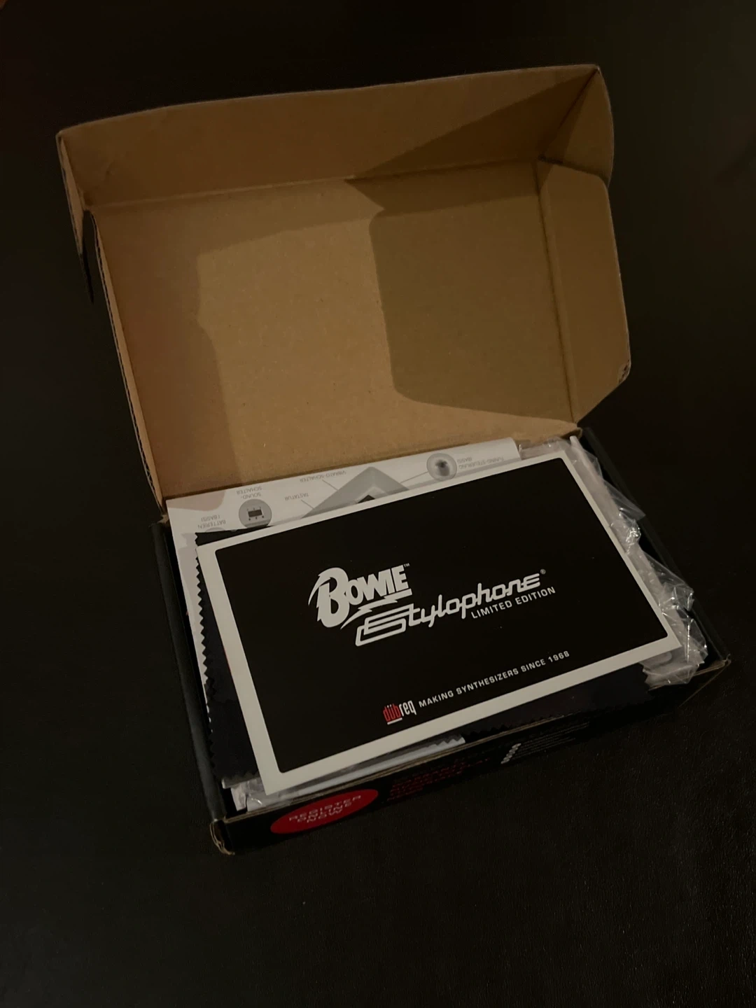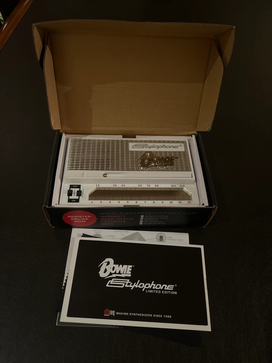 This is a Bowie Limited Edition Stylophone, an analog portable synthesizer. It's white with silver accents and includes the stylus. Comes with original box and paperwork.
