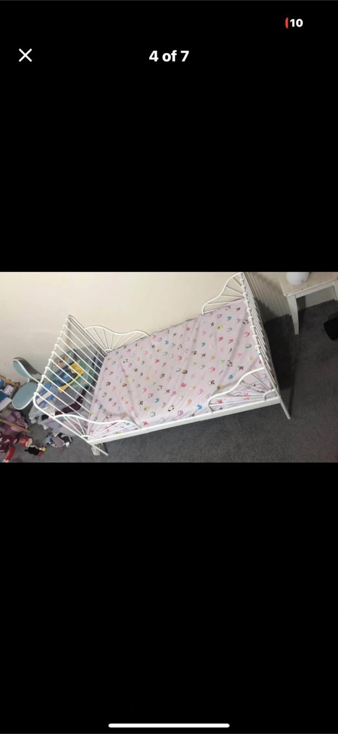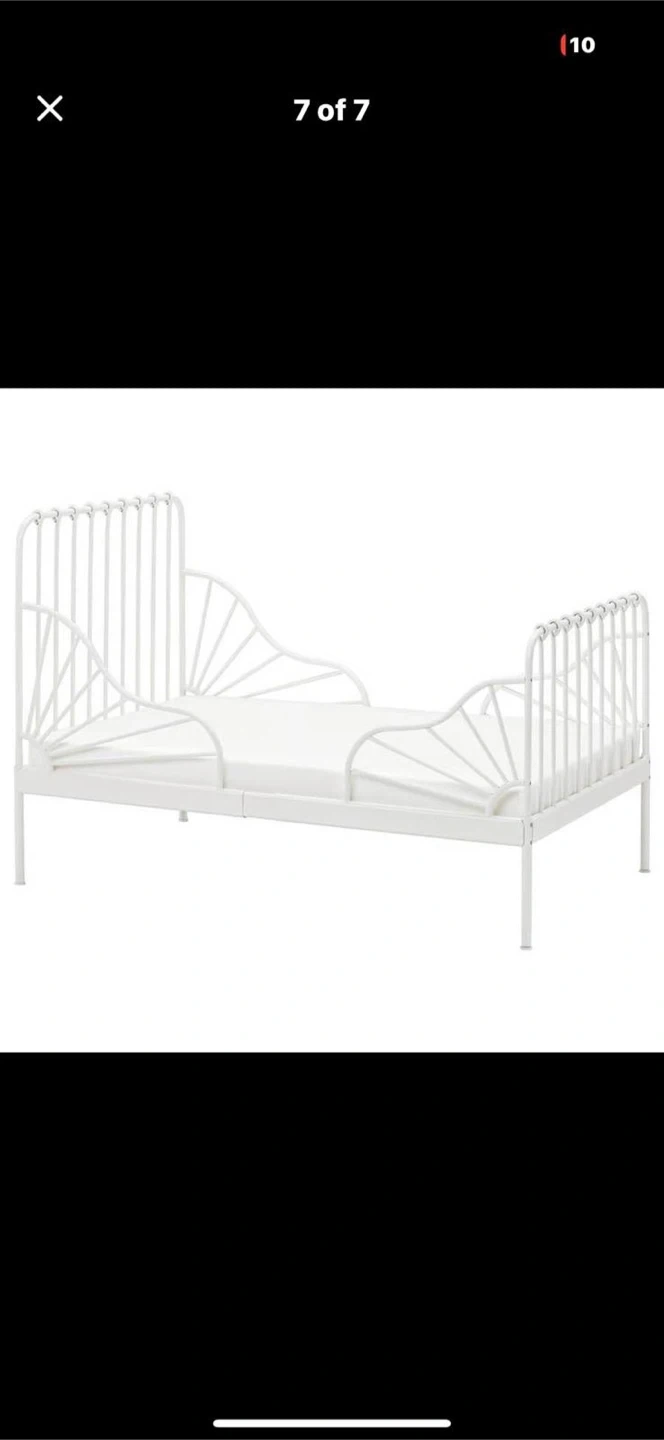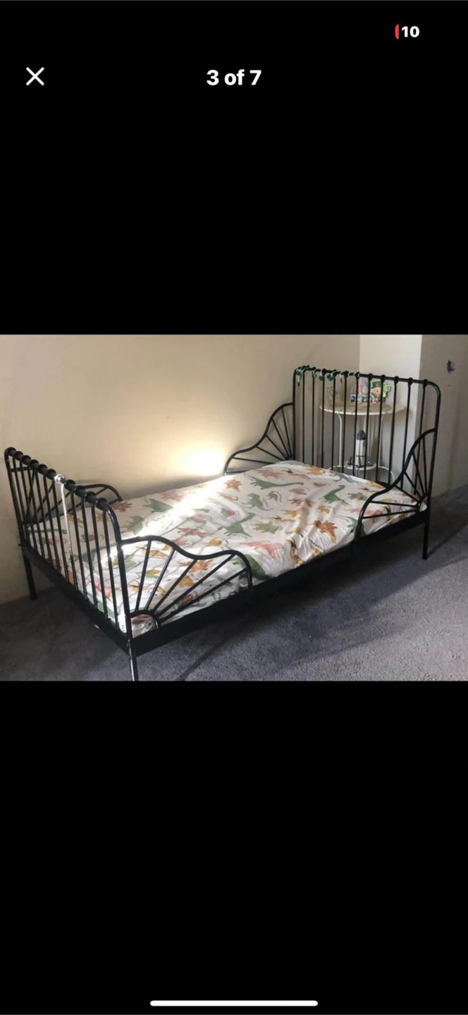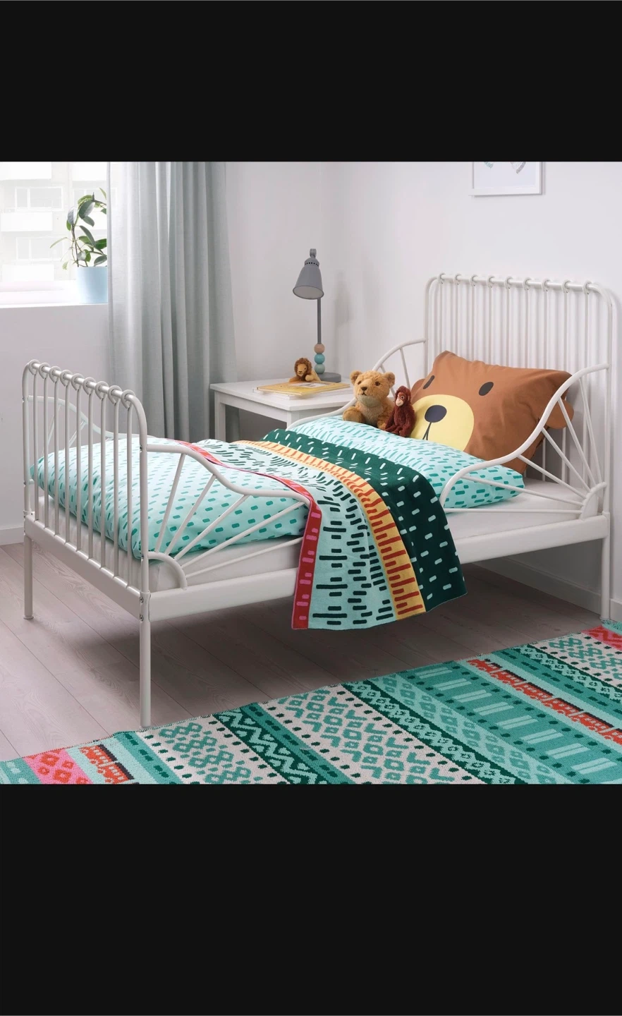 IKEA MINNEN extendable bed frame in white & black . It comes with a slatted bed base. This bed frame is suitable for children and can be adjusted as they grow and pickup from Burnaby