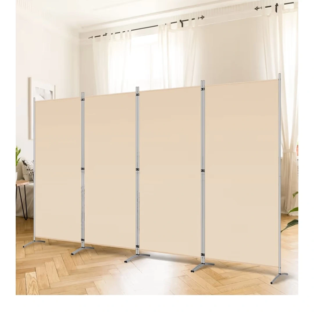 This four-panel room divider is beige with a metal frame. It's freestanding and can be easily set up to create privacy or divide spaces. Panels connect to upright poles with adjustable stands for stability.