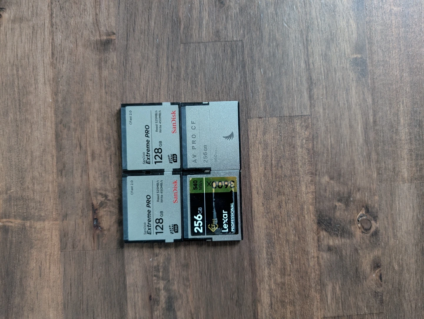 Storage (The Big Plus): 4x CFast 2.0 Cards (768GB Total) + Lexar Reader