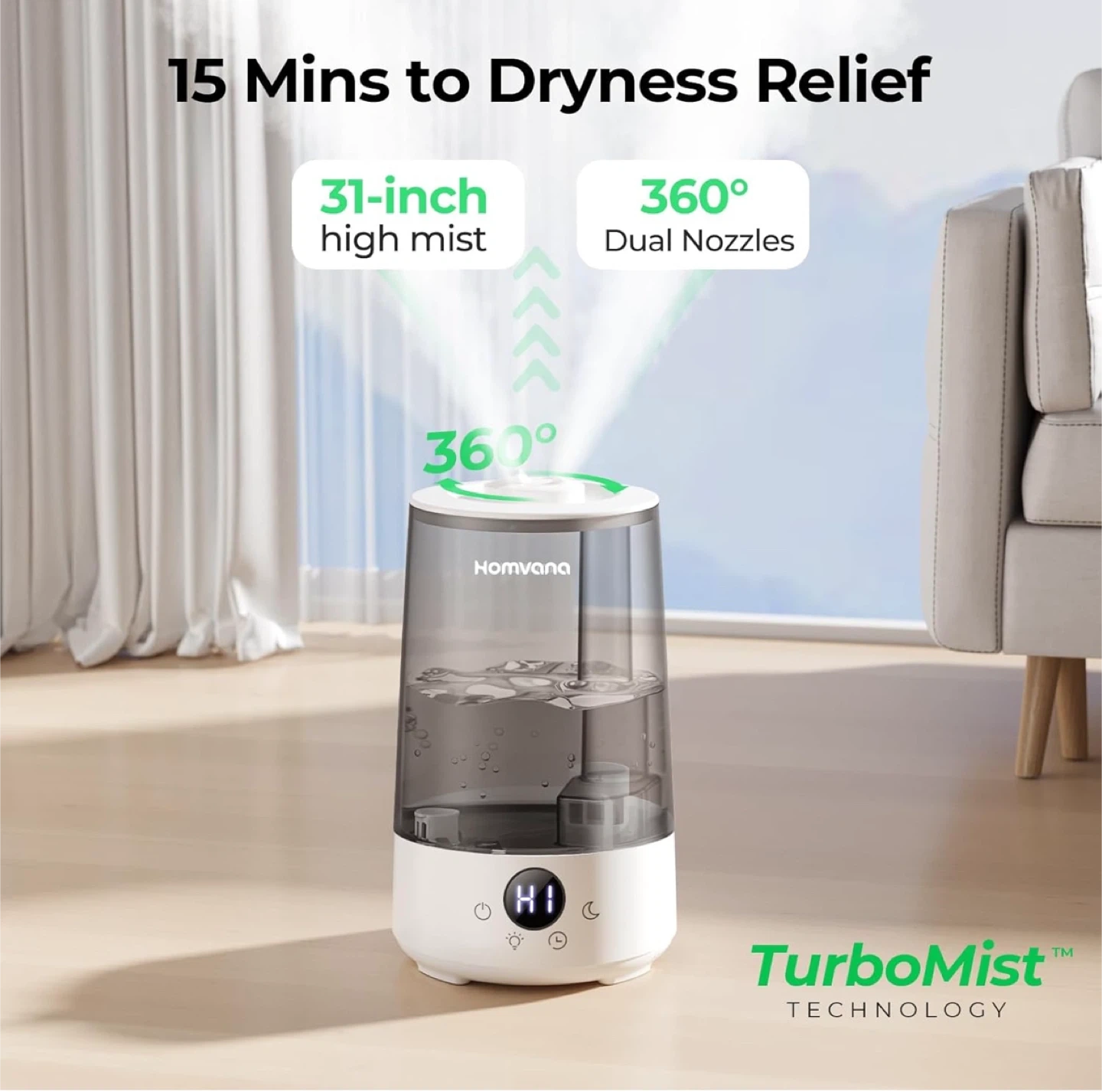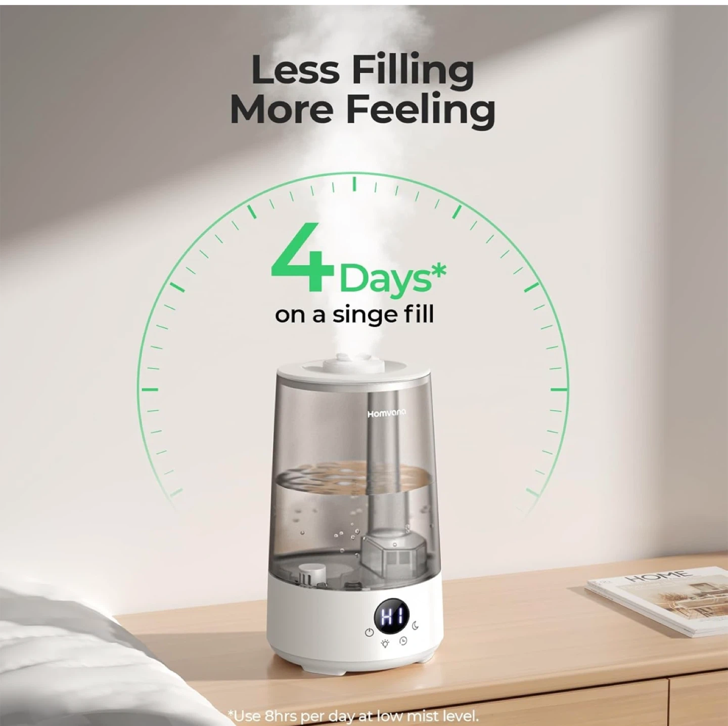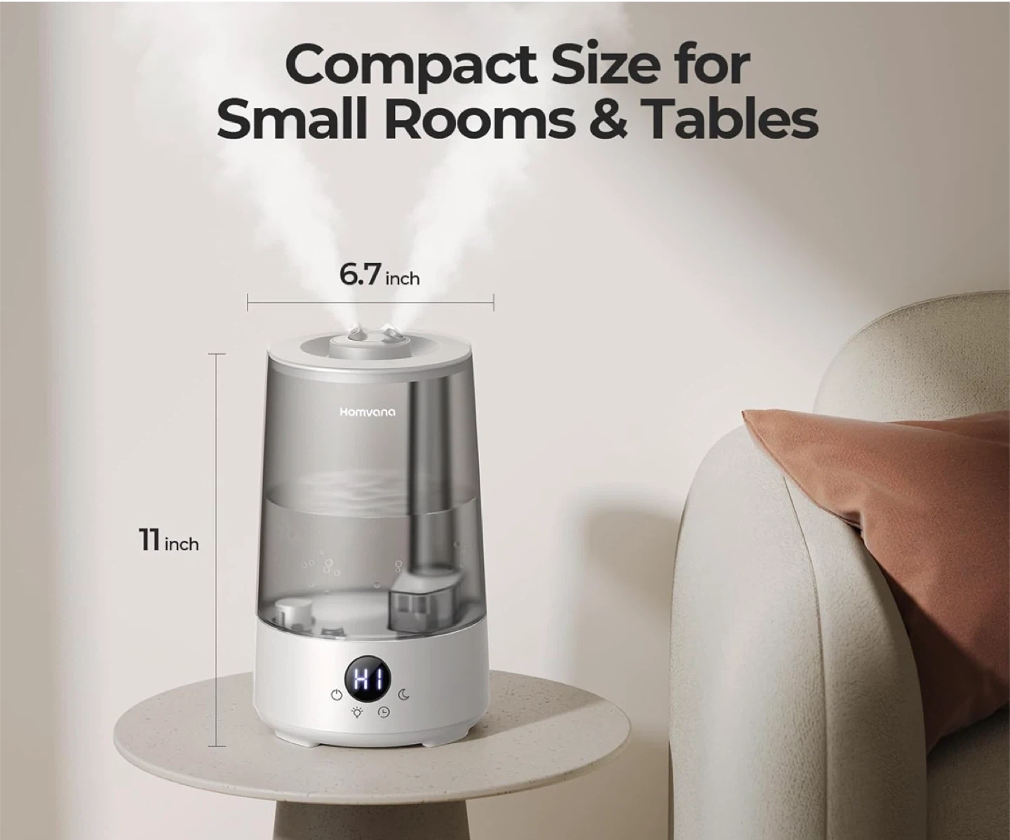 It's a compact size, perfect for small rooms and tables. Enjoy up to 4 days of use on a single fill. The box is included!