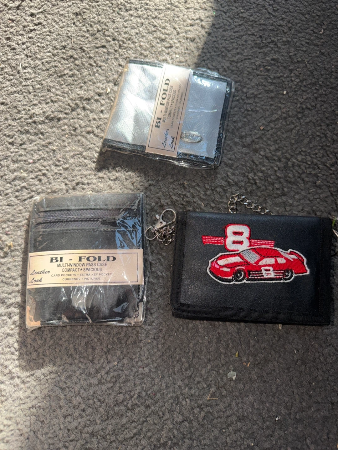 Includes a silver bi-fold wallet with leather look and a black bi-fold wallet with multi-window pass case. Also features a black wallet with a racing car design and chain. Each wallet offers card pockets and picture slots.