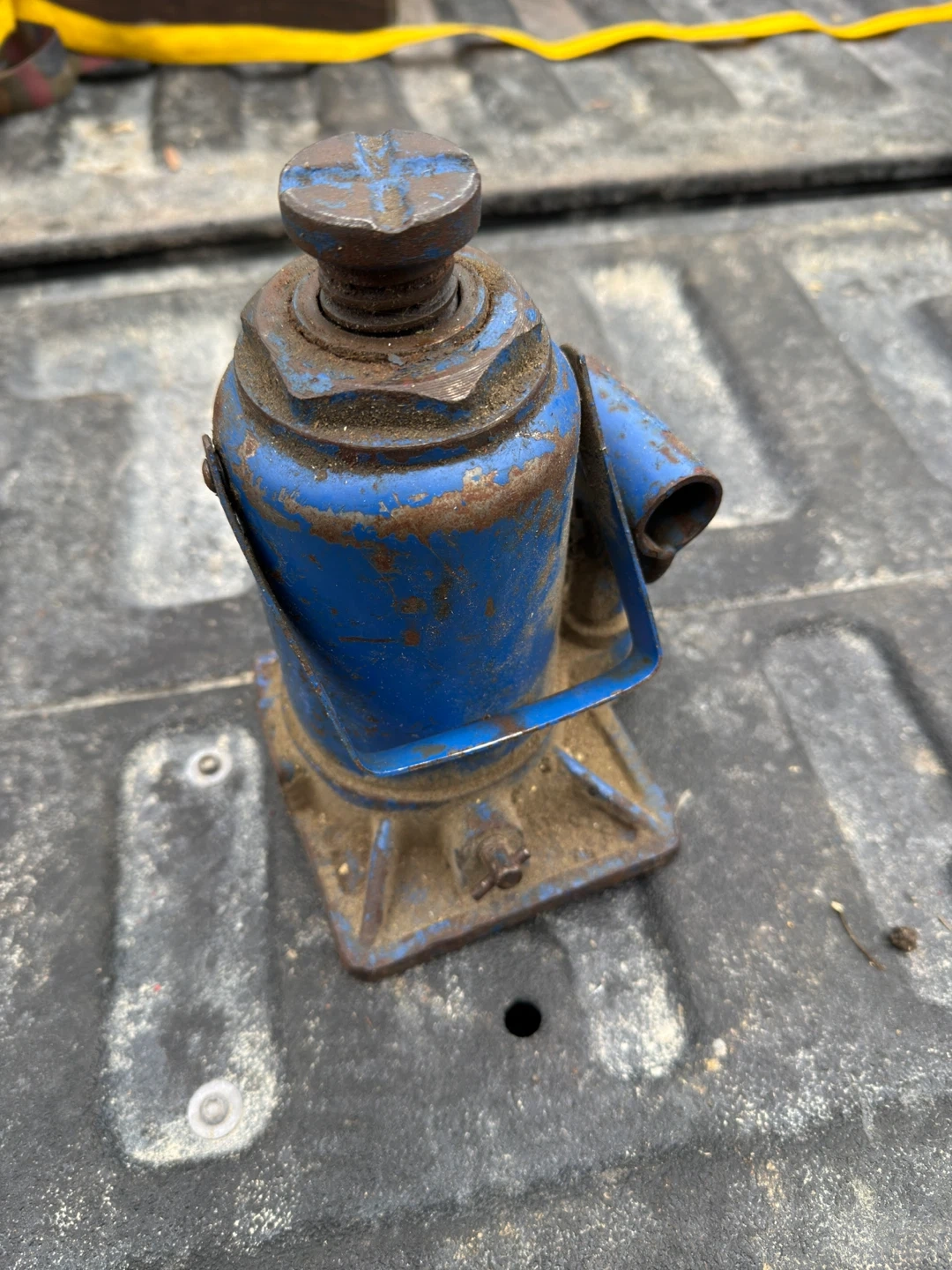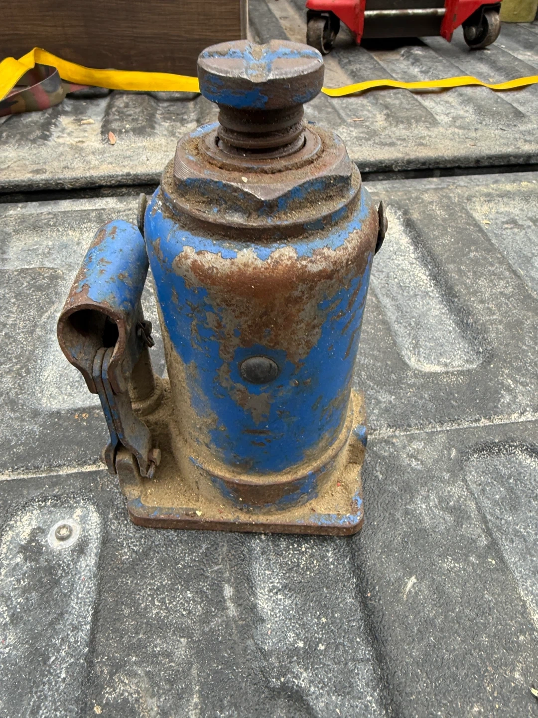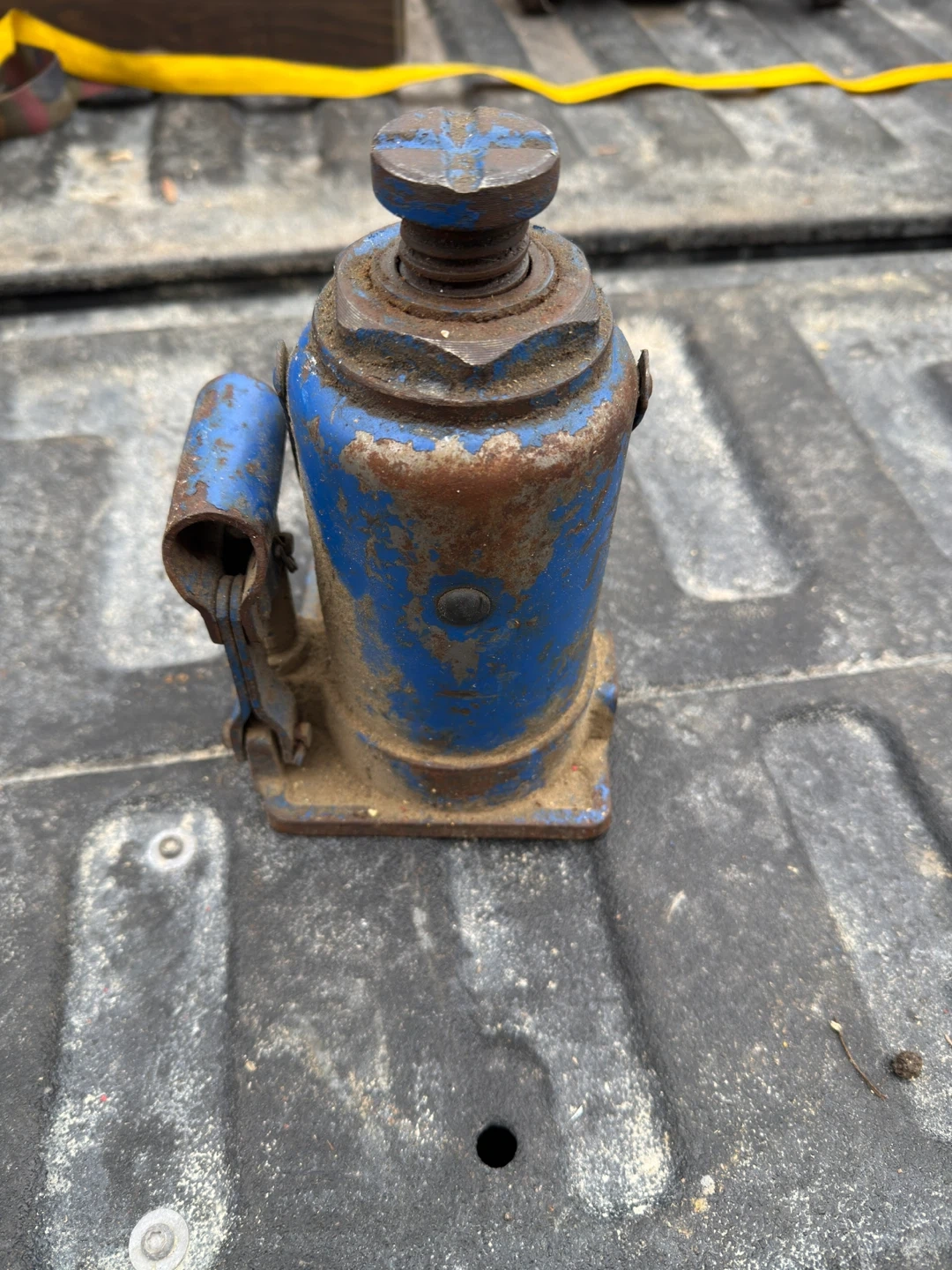 This is a sturdy blue bottle jack. It's made of metal and has a bit of wear and rust. It's a classic piece of equipment for lifting vehicles or other heavy objects.