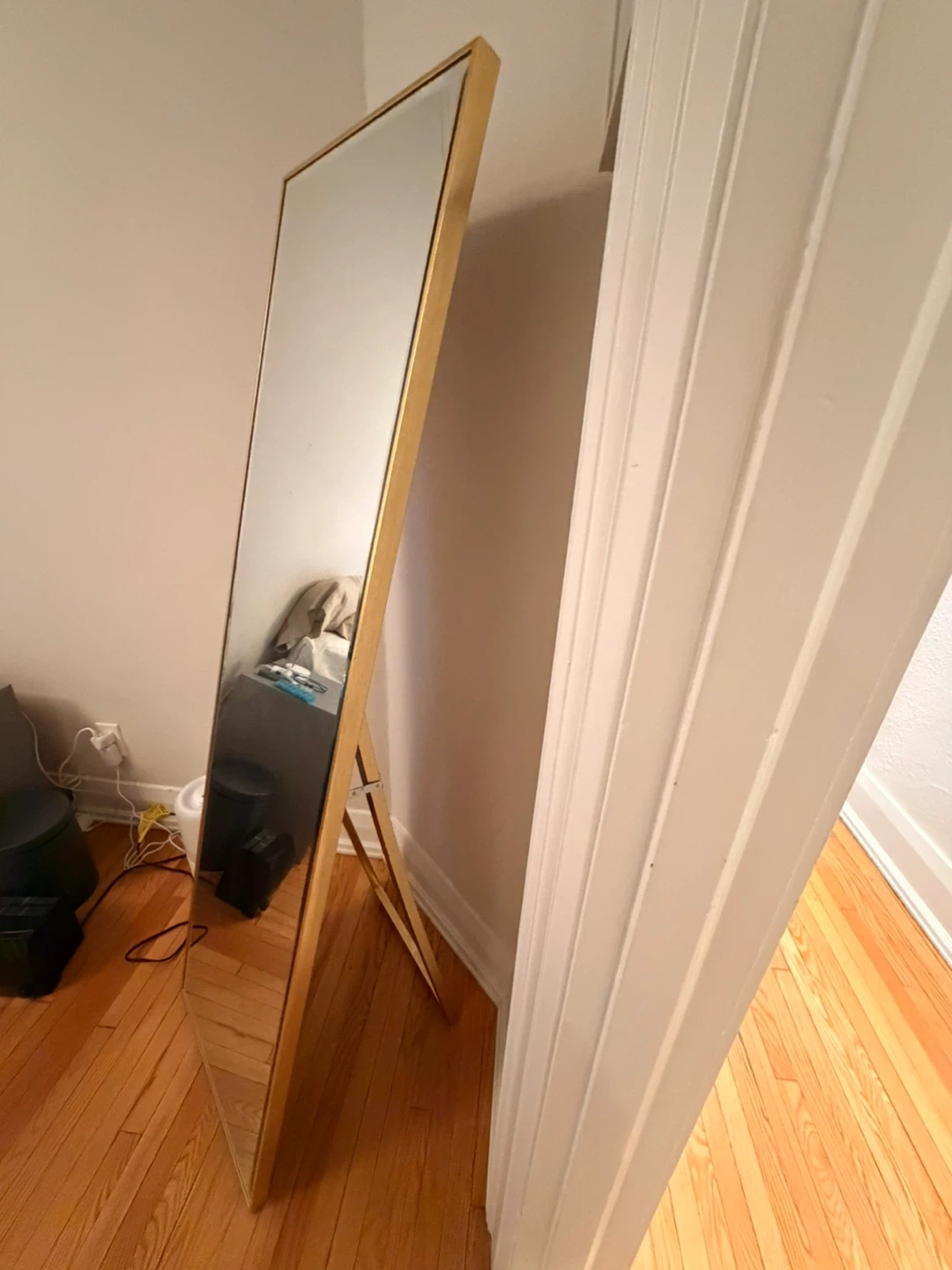 Selling a full-length mirror with a gold frame! It's in great condition and would look lovely in any room. It's perfect for checking out your outfit before heading out or just adding a touch of elegance to your space