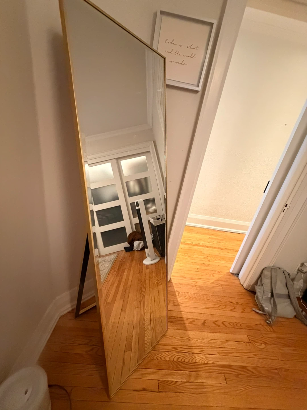 Selling a full-length mirror with a gold frame! It's in great condition and would look lovely in any room. It's perfect for checking out your outfit before heading out or just adding a touch of elegance to your space