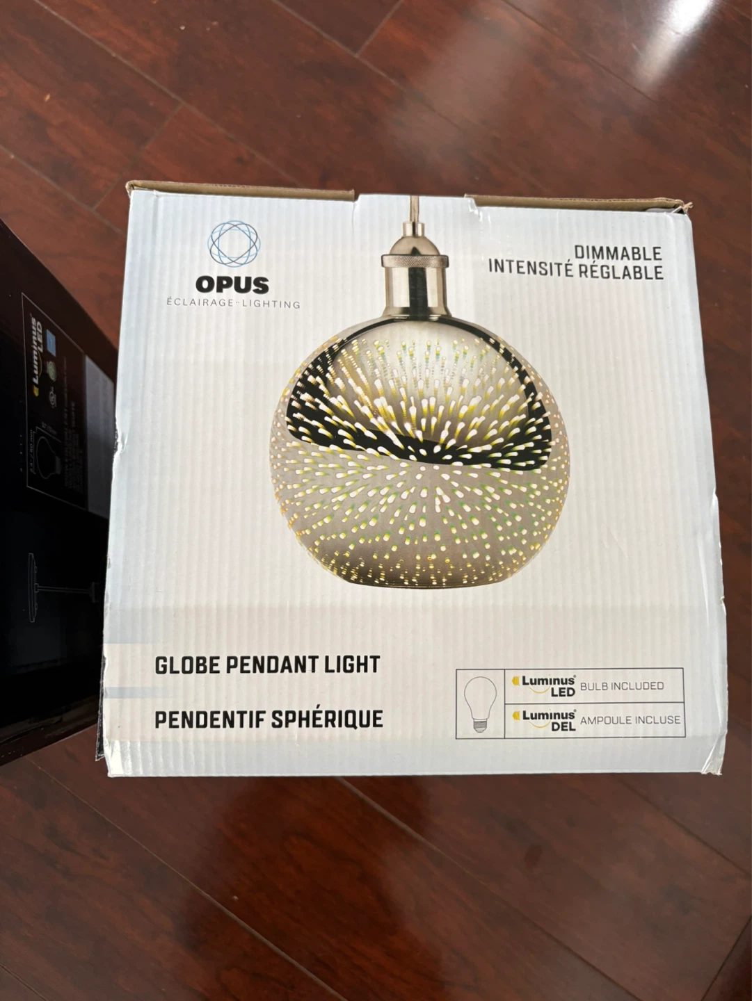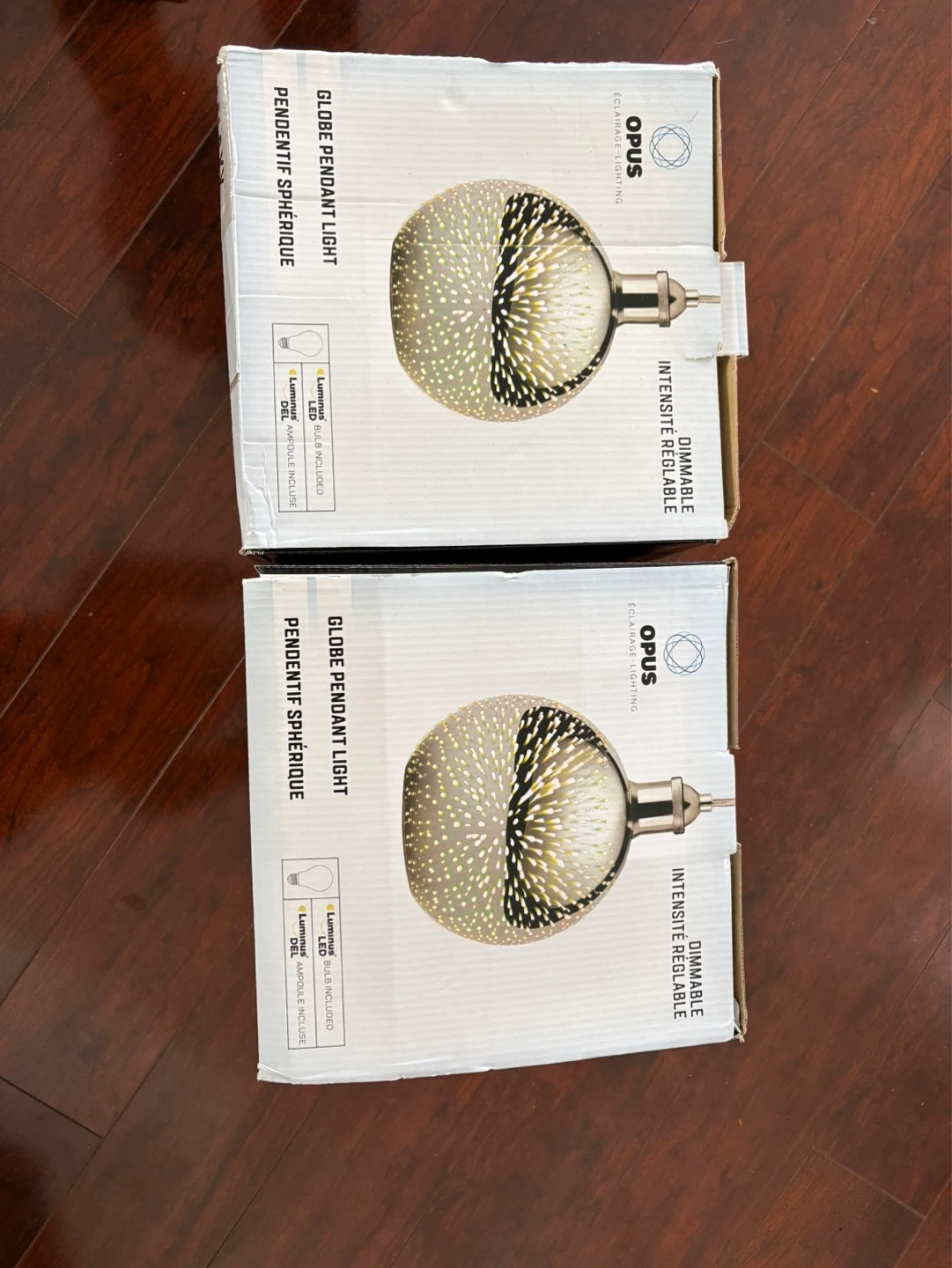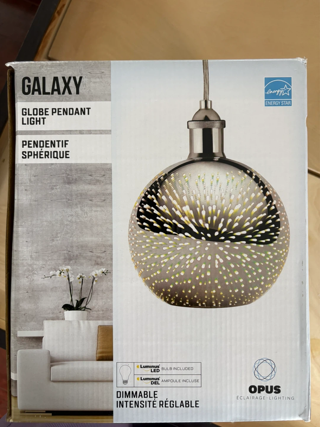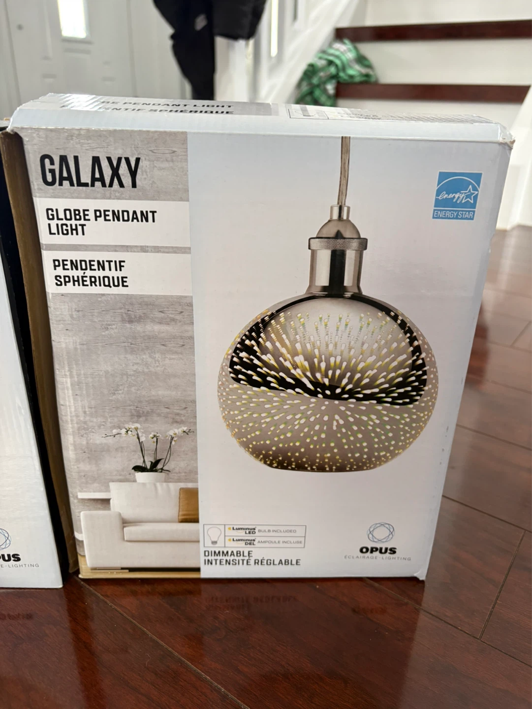Globe pendant light with a 3D starburst design. Dimmable, 100W equivalent LED bulb (15W) included. 15,000 hours of light.Two pieces.It’s brand new not opened or installed yet.