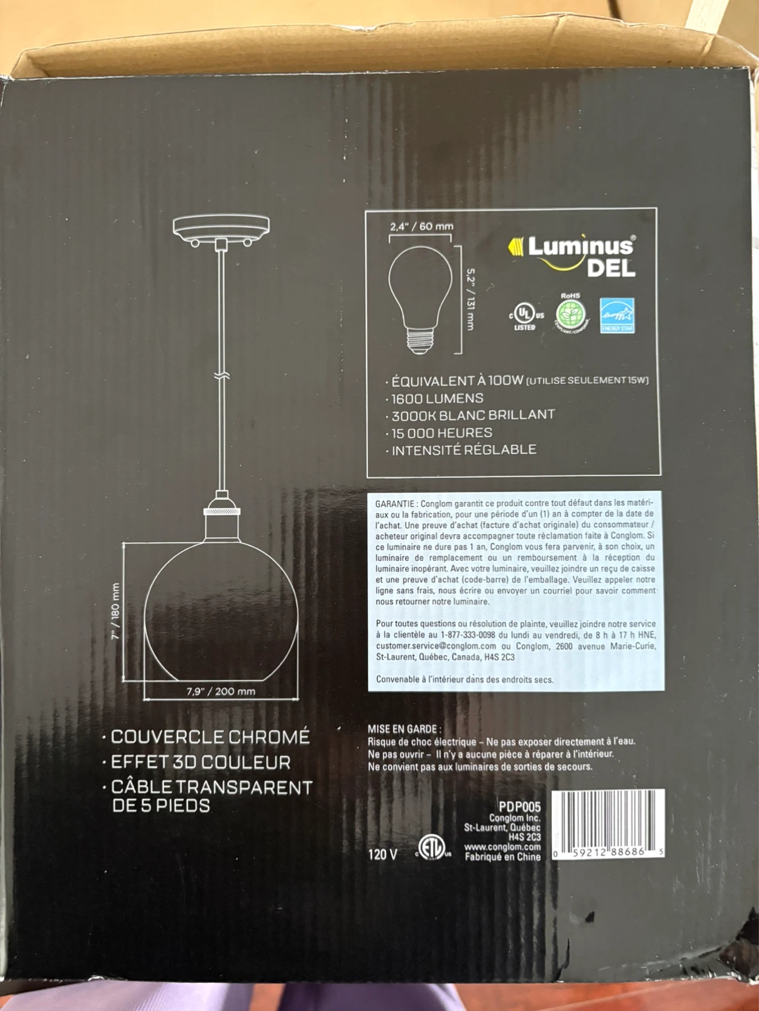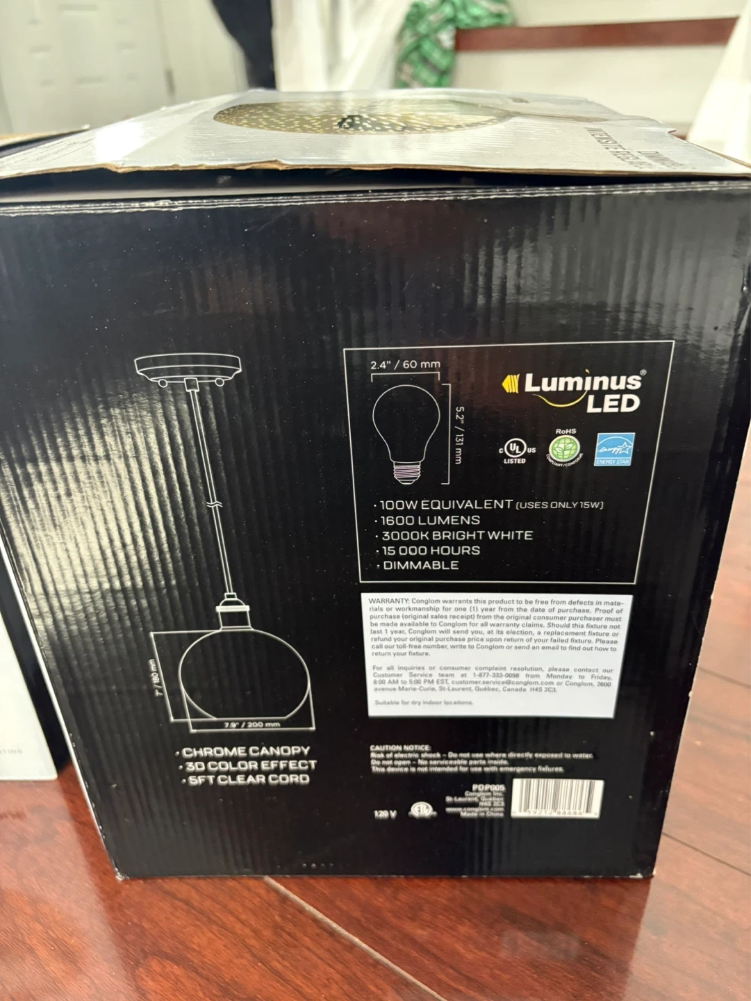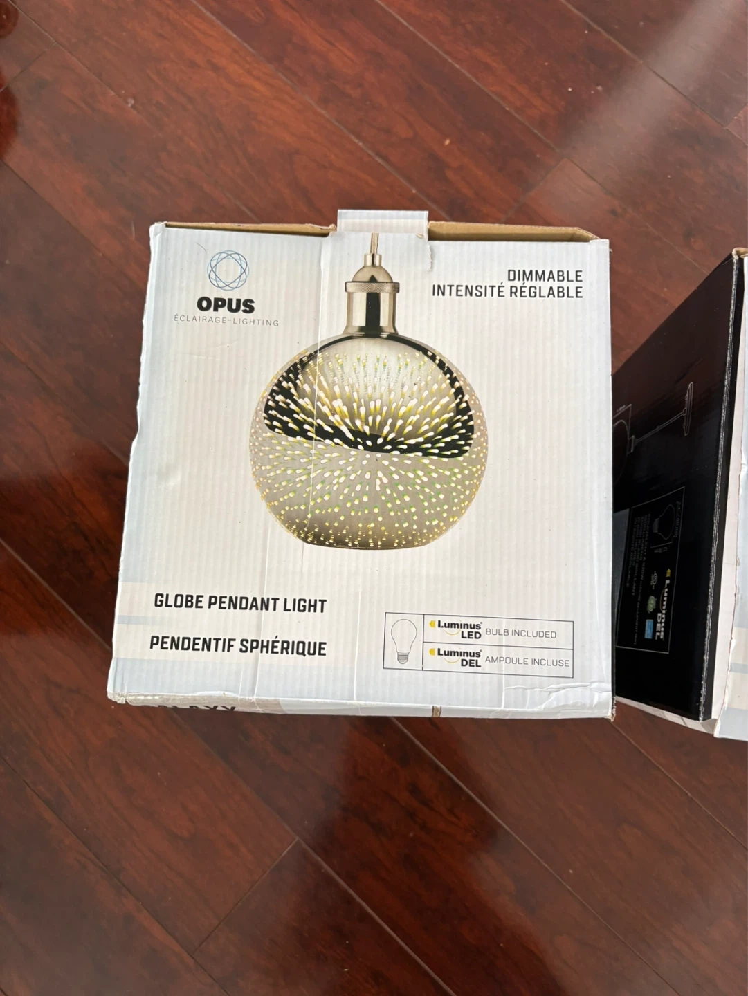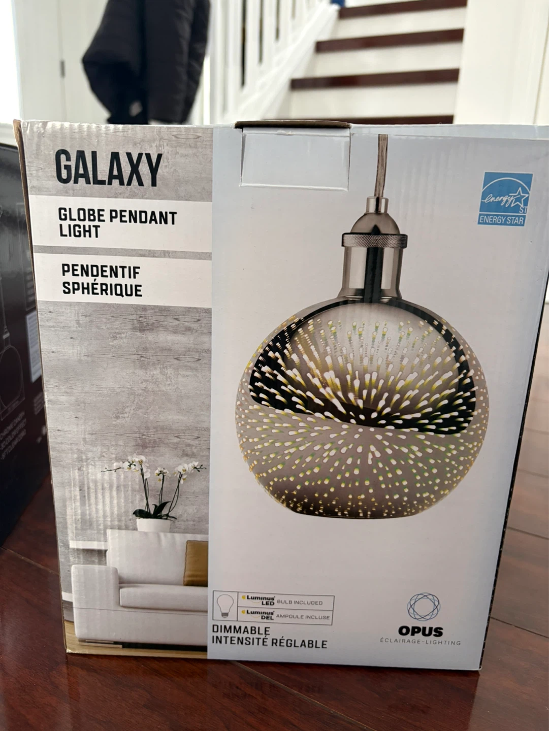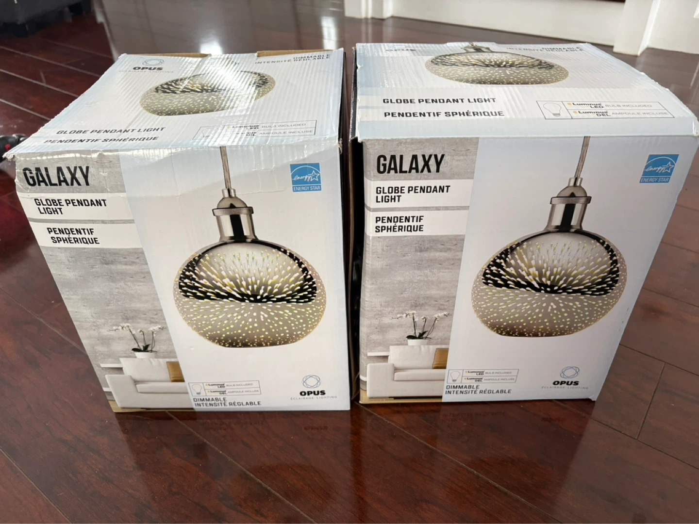 Globe pendant light with a 3D starburst design. Dimmable, 100W equivalent LED bulb (15W) included. 15,000 hours of light.Two pieces.It’s brand new not opened or installed yet.