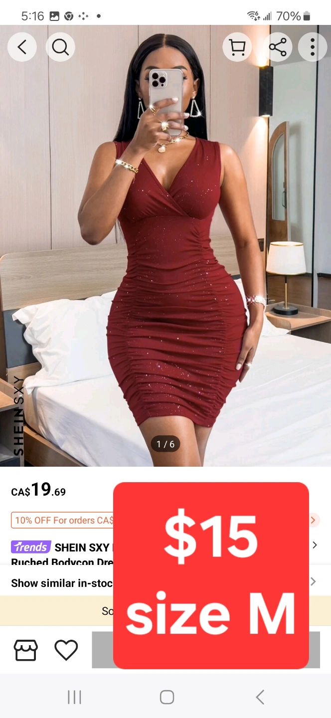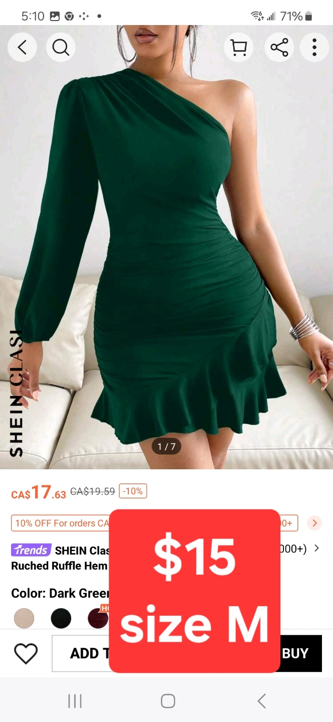 Three SHEIN dresses, size medium. One geometric print bodycon dress, one emerald green ruched one-shoulder dress, and one burgundy v-neck dress. All in excellent condition.