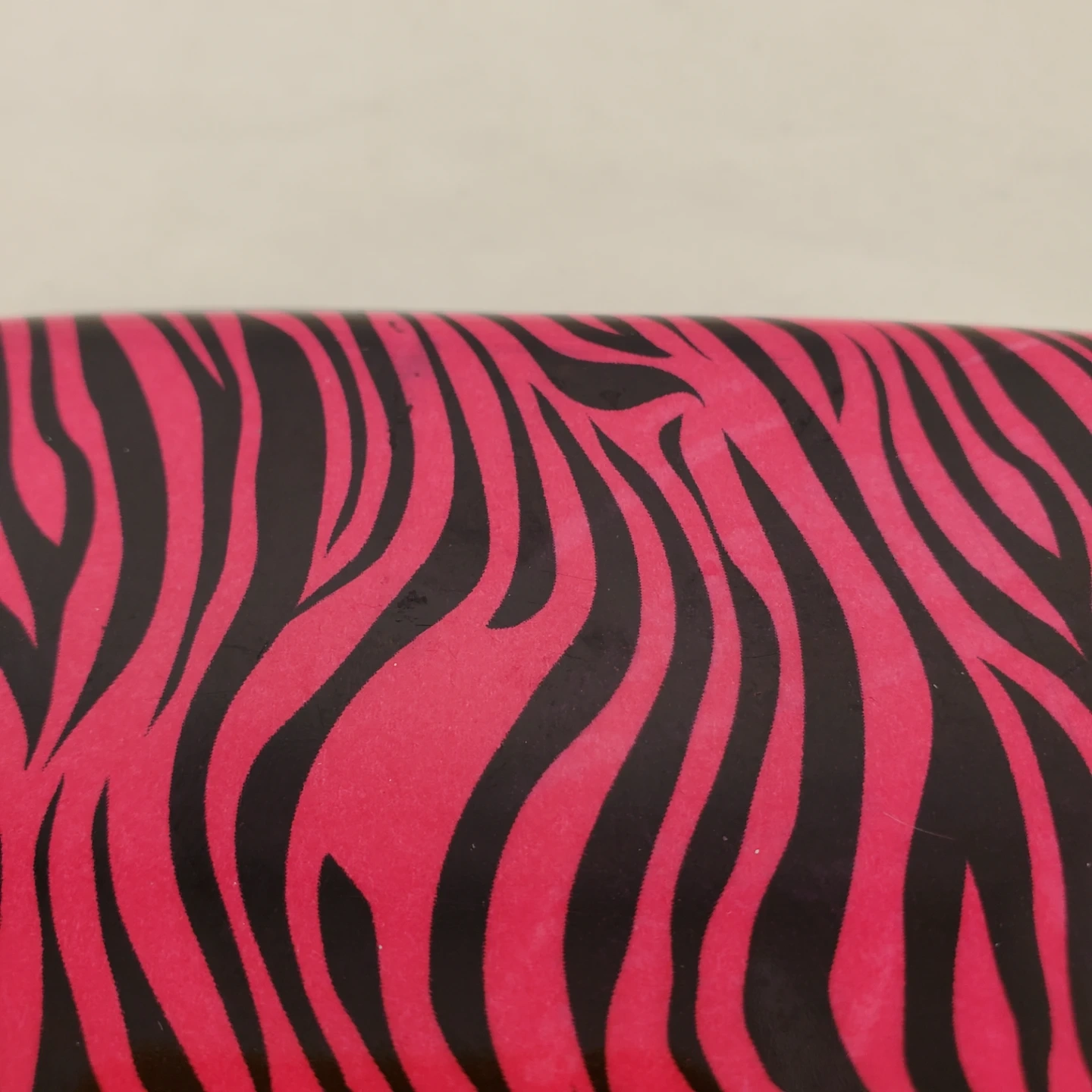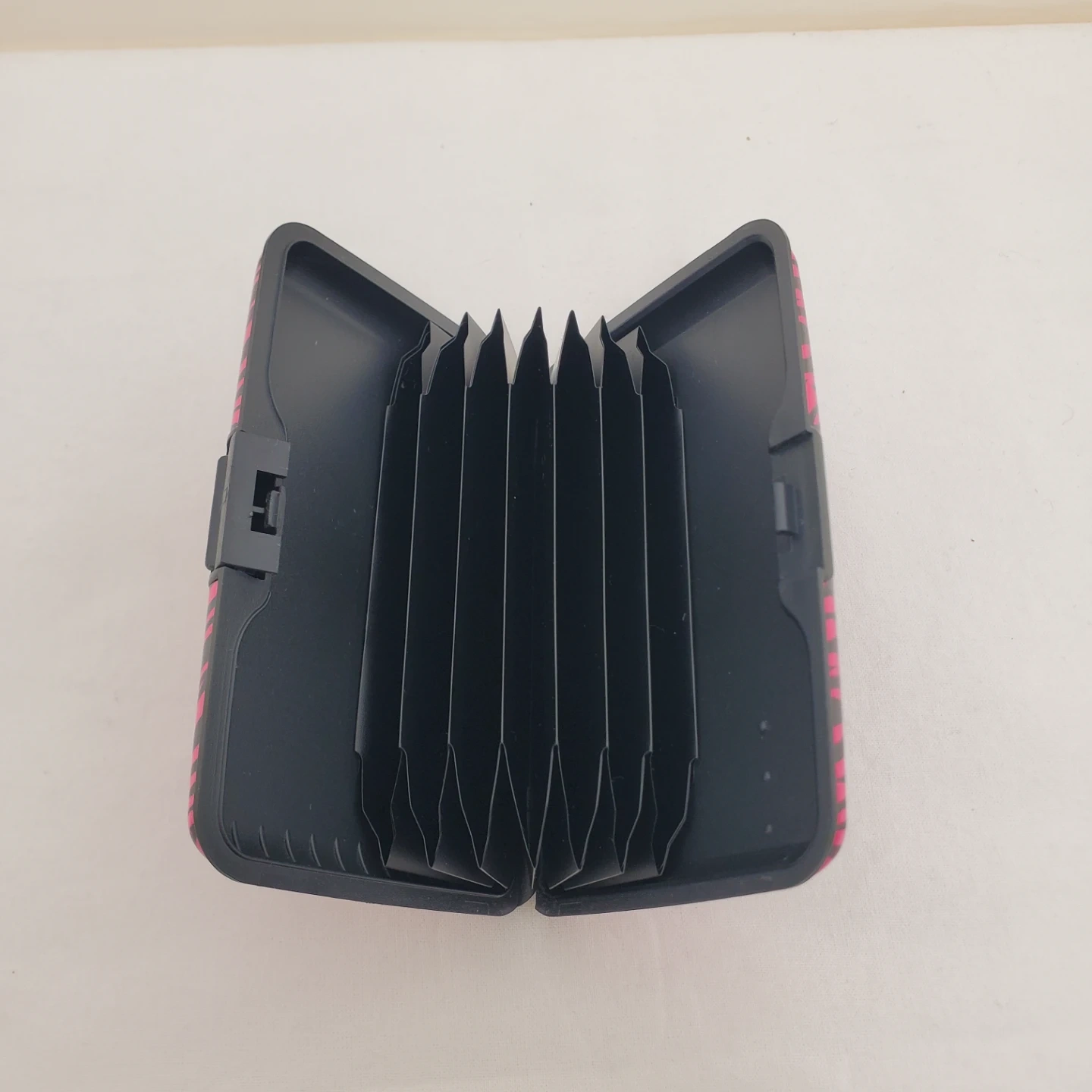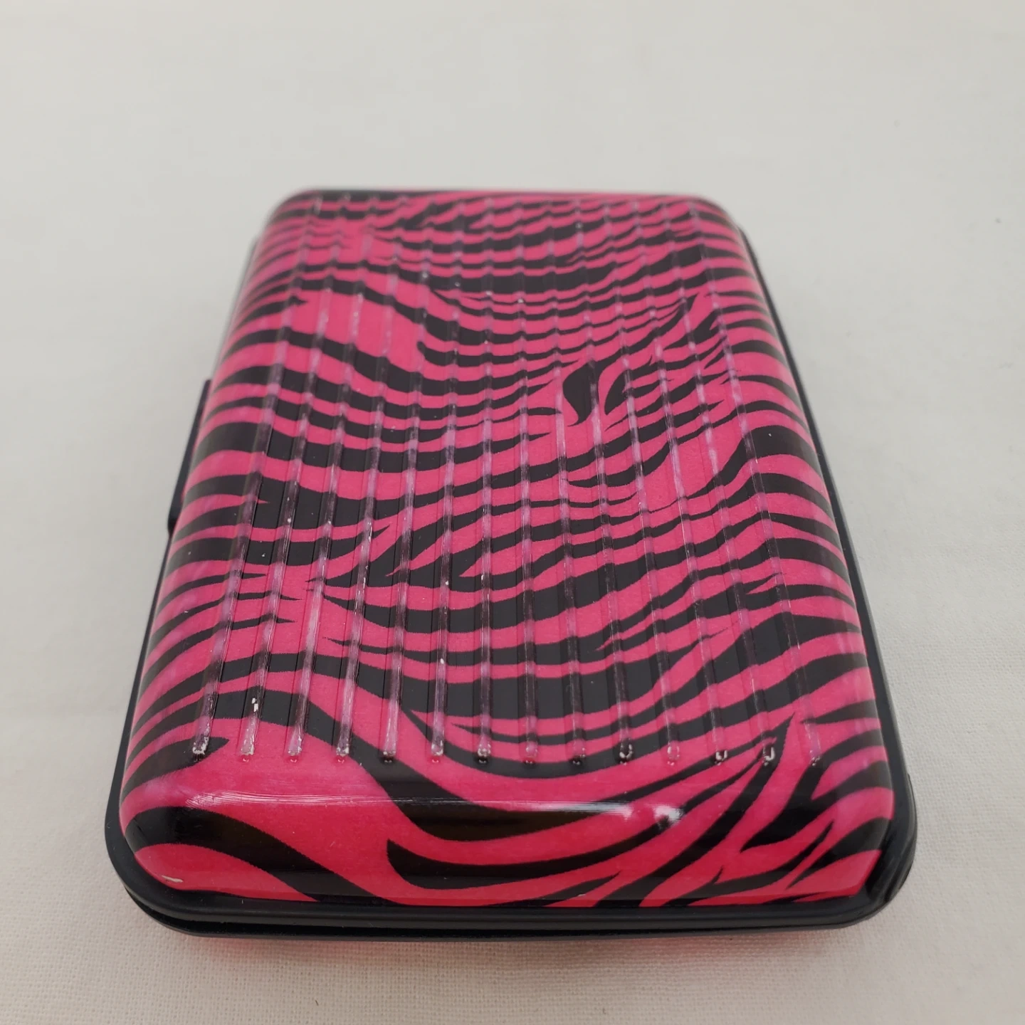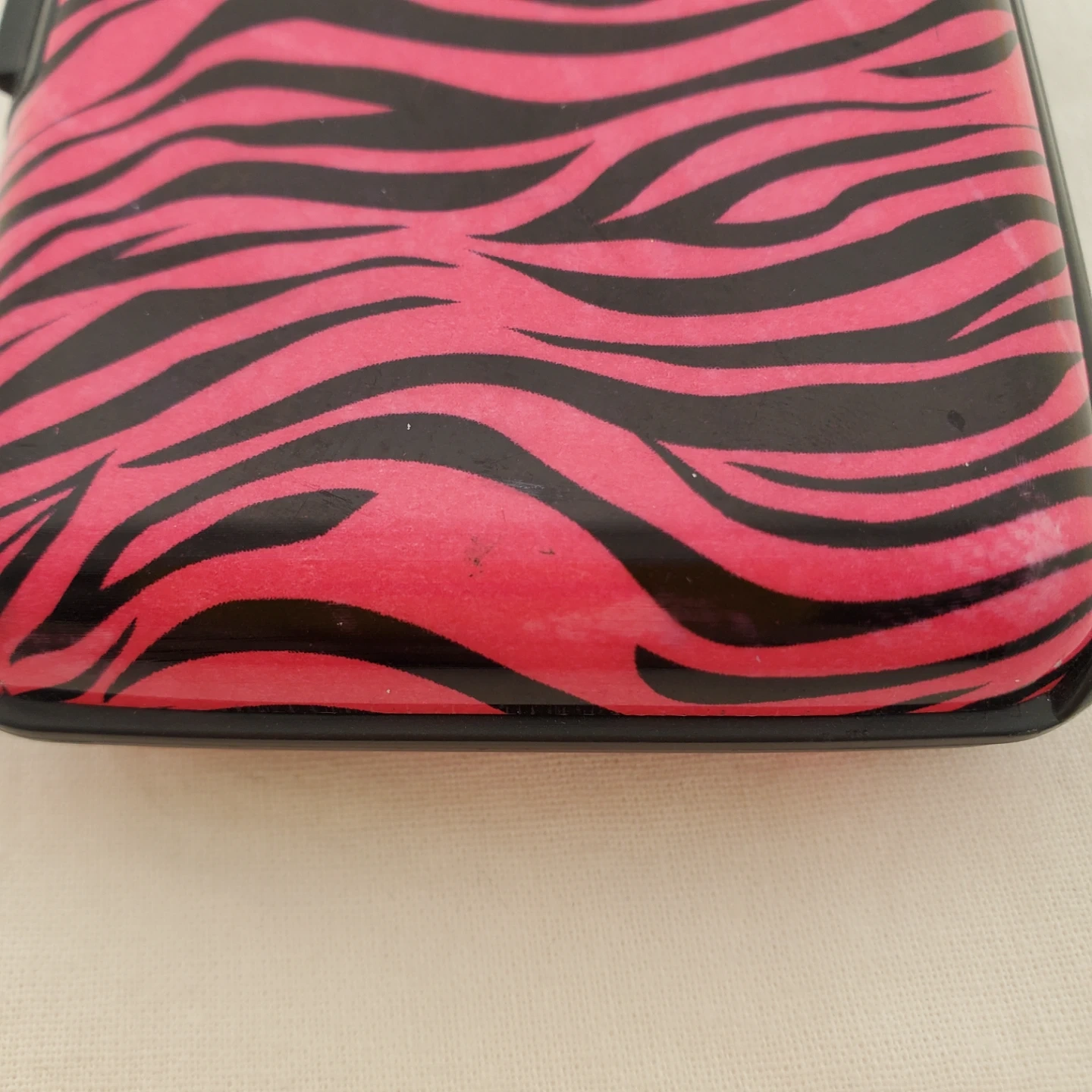 A compact card holder featuring a bold pink and black zebra print. It opens to reveal multiple slots for organizing your cards. Has some wear but it is in over all good shape. Located northside.