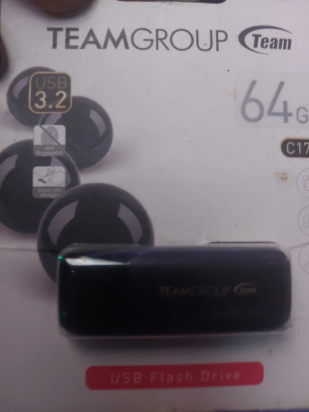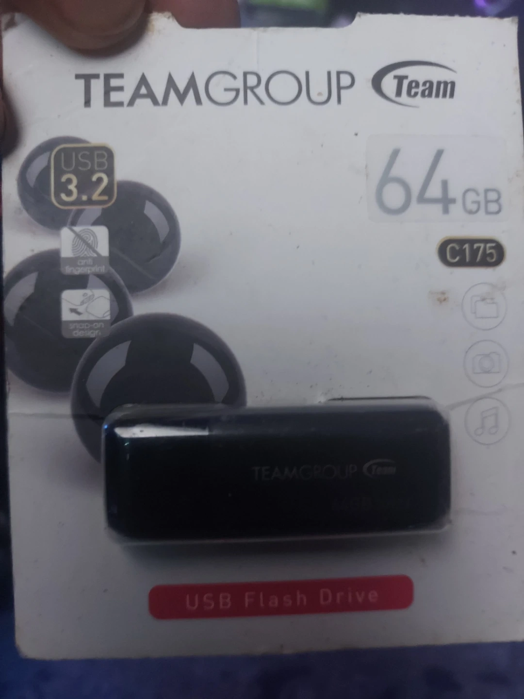 This is a TEAMGROUP 64GB USB 3.2 flash drive. It features a snap-on design and anti-fingerprint surface. This drive is great for storing and transferring files quickly!
