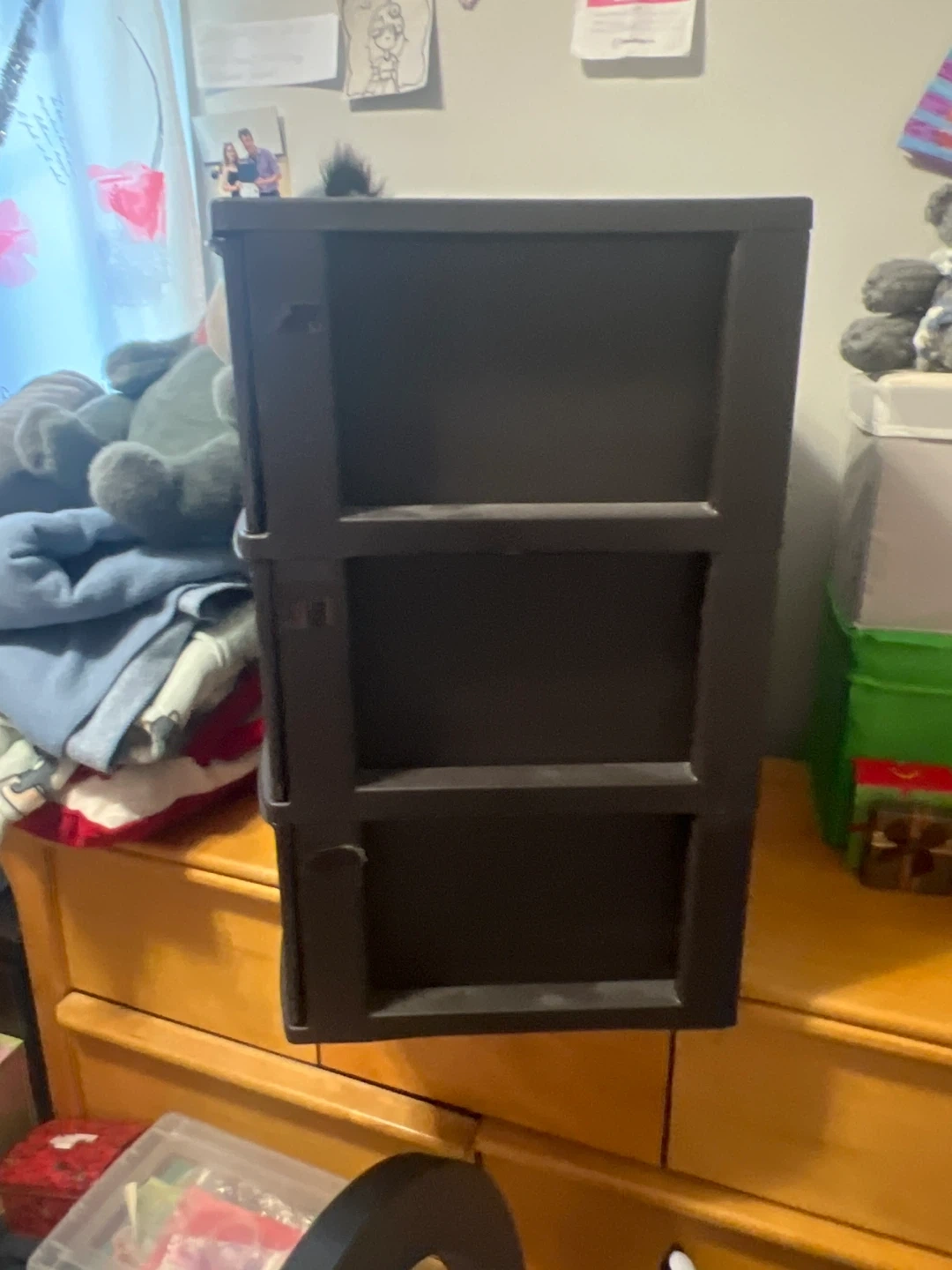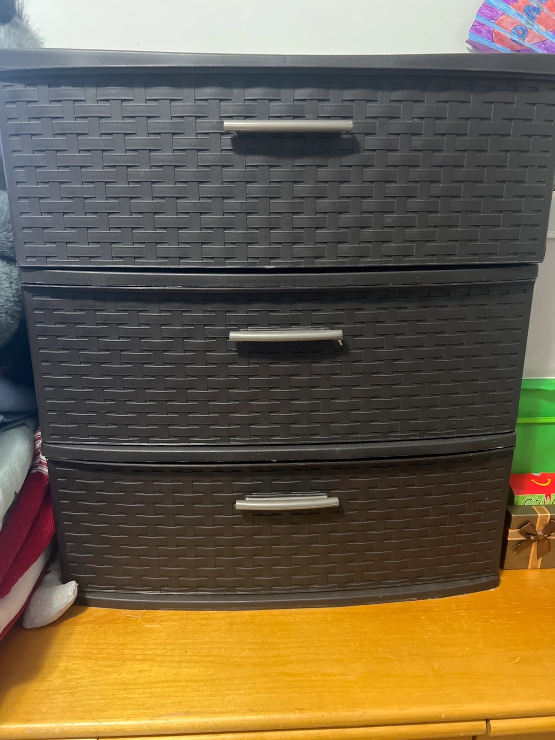 A dark brown, three-drawer plastic storage unit with a woven texture on the drawers. It's a compact size, perfect for small spaces. Drawers slide out easily.