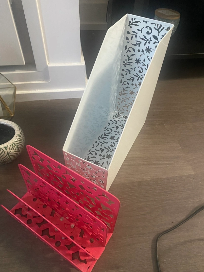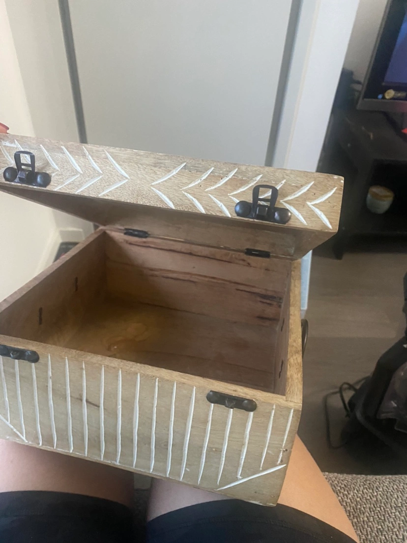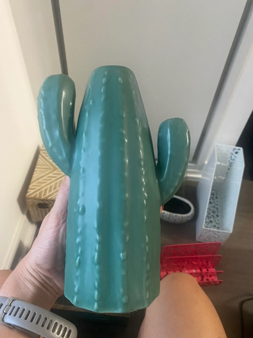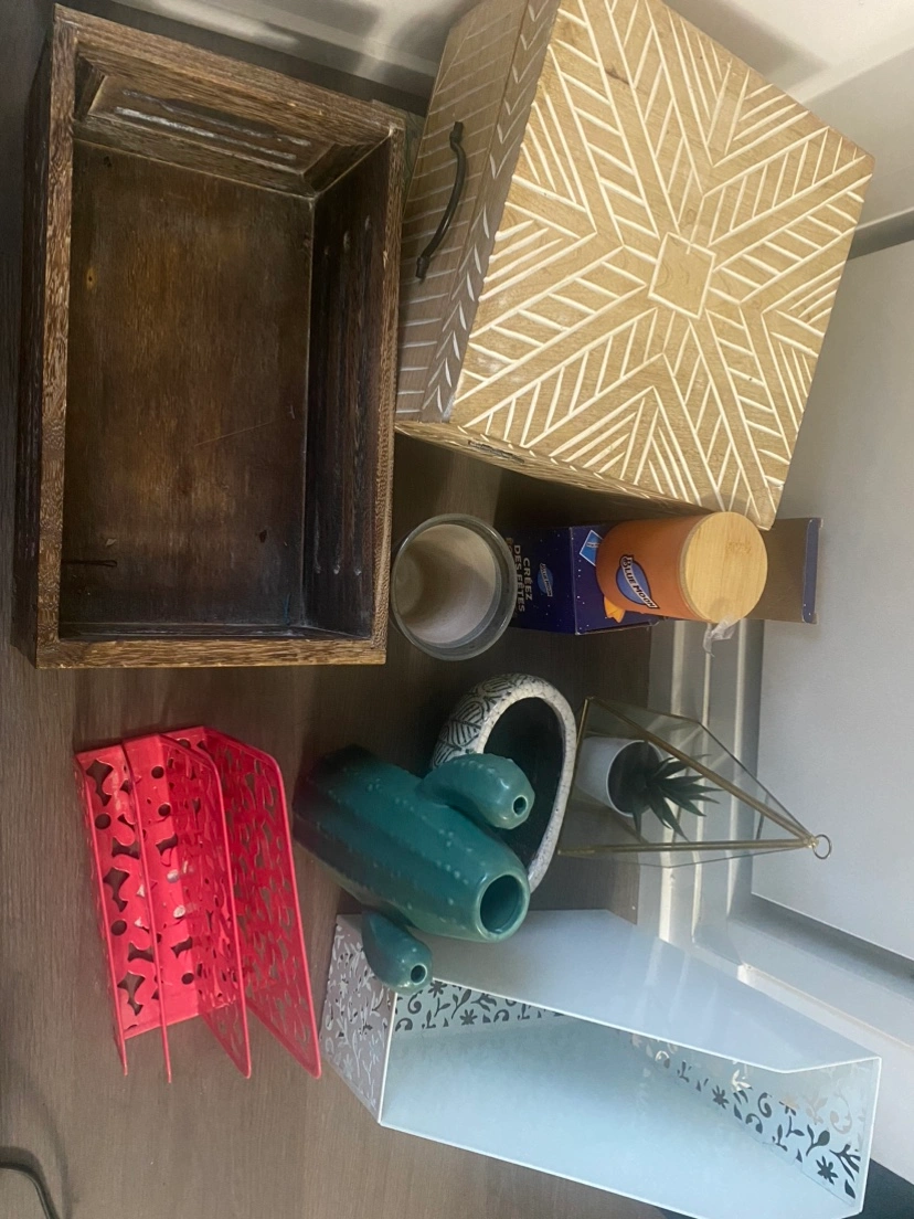 A bundle of home decor items including a cactus vase, two candles, a wooden box, a crate, two plant pots, letter holders and table decor. Price is for all