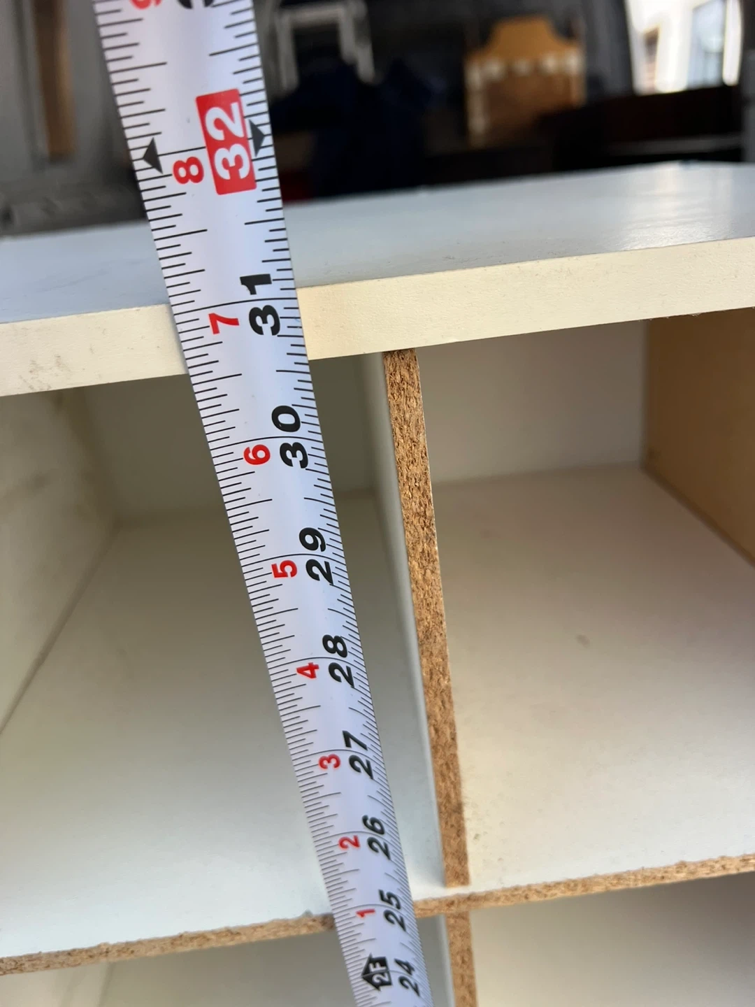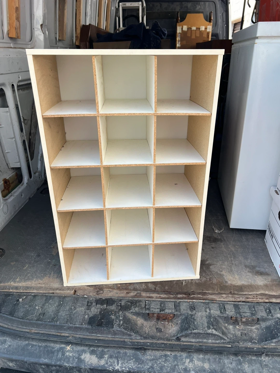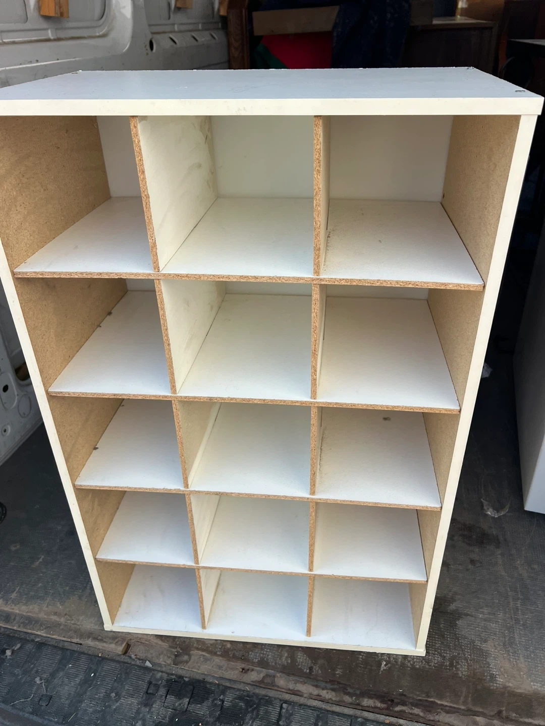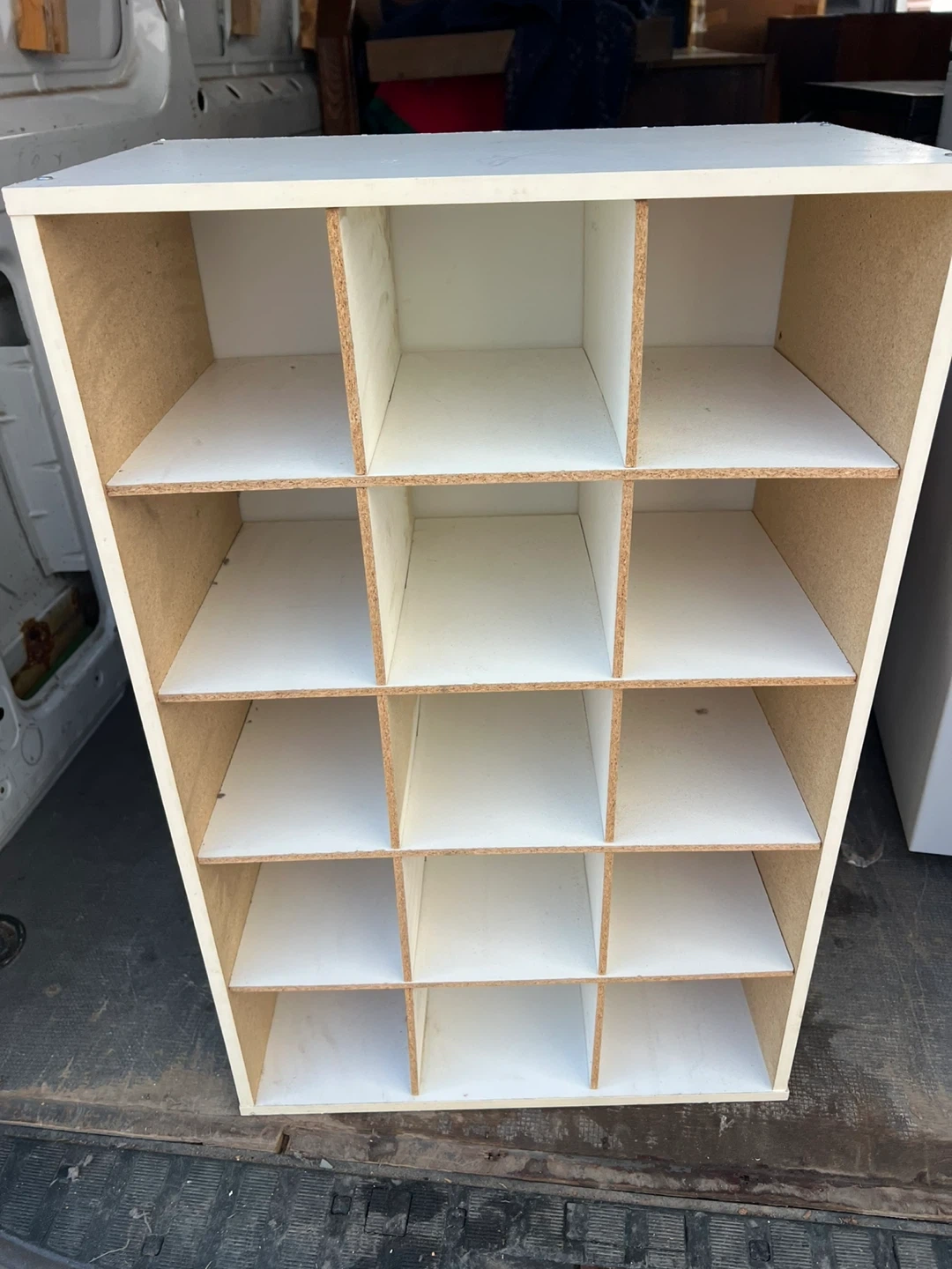 Used White cube organizer shelf with 12 compartments. Made of particle board with a laminate finish. Great for shoes, books, or crafts!