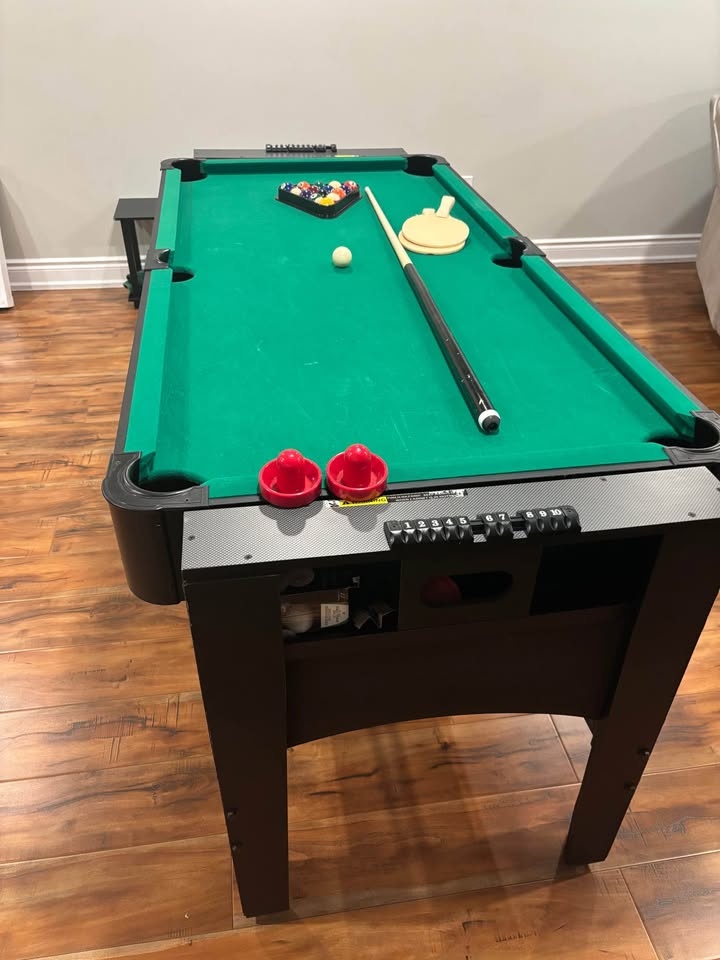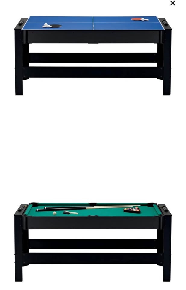 This is a 3-in-1 game table featuring a rotating pool table, ping pong, and air hockey. It's 72 inches long and has been used but is in good condition. One cue stick is missing, but all other accessories are included. You can find more details about this Fat Cat Flip 3-in-1 72" Multi Game Table here: https://www.wayfair.ca/furniture/pdp/fat-cat-flip-3-in-1-72-multi-game-table-cat1084.html