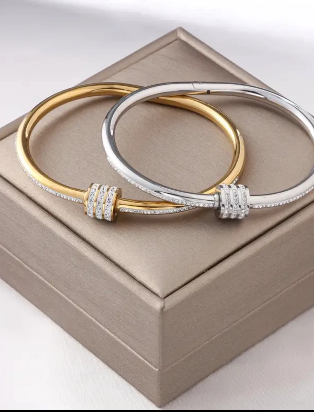 Selling a silver or gold bangle bracelet. It features a unique design with a decorative centrepiece. One size fits all. Brand new
