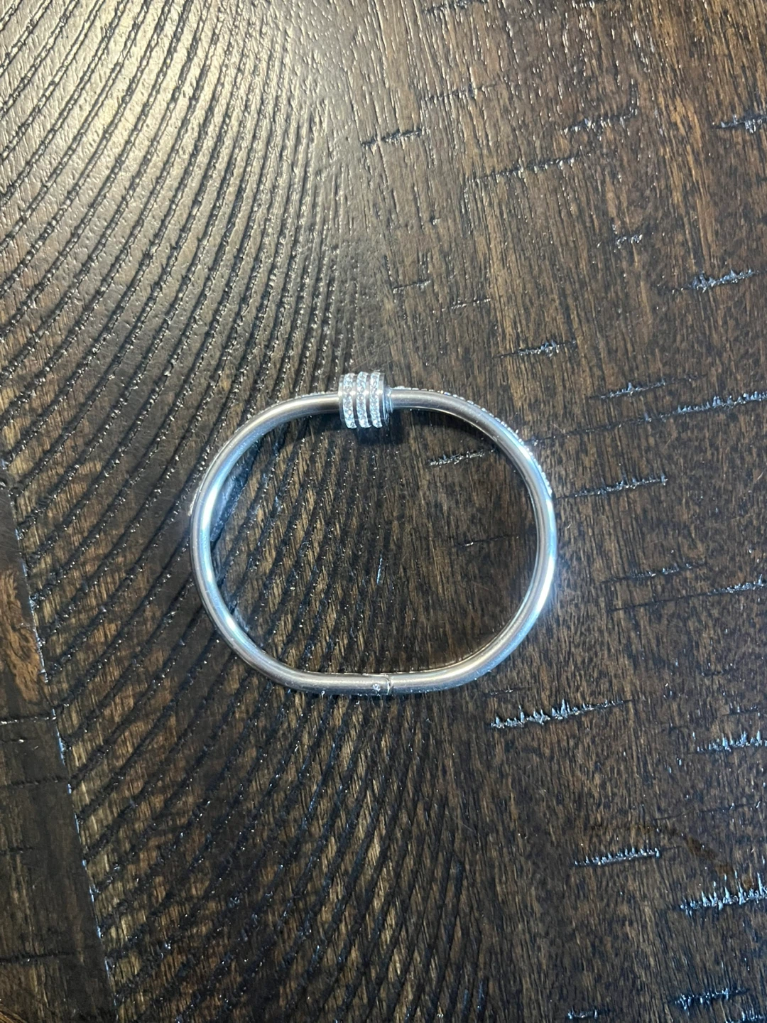 Selling a silver or gold bangle bracelet. It features a unique design with a decorative centrepiece. One size fits all. Brand new